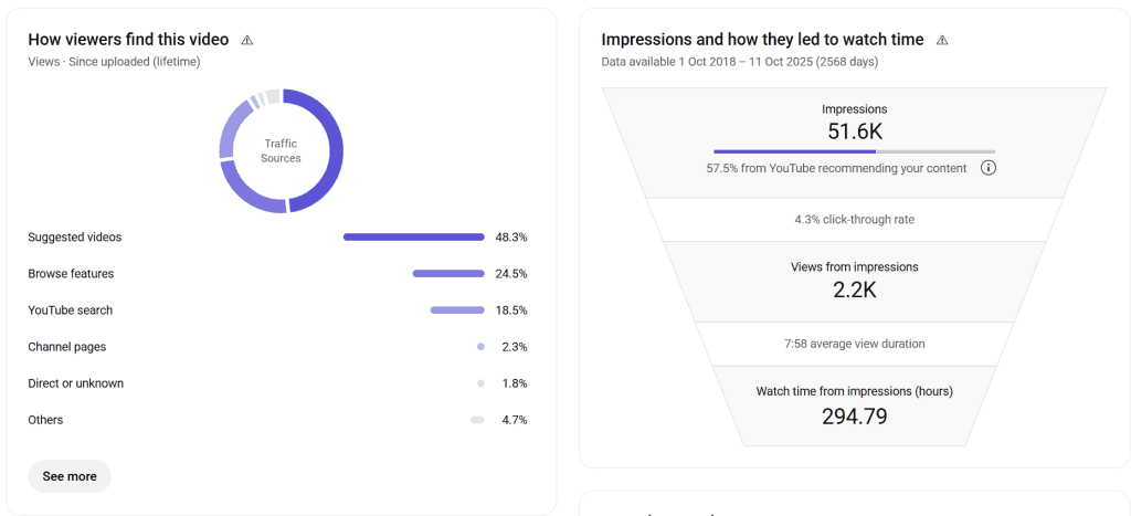 Even worse, the system is promoting my own older videos as the main traffic sources for my new uploads. That means YouTube’s algorithm isn’t helping me reach new audiences at all — it’s simply recycling my existing viewers.
