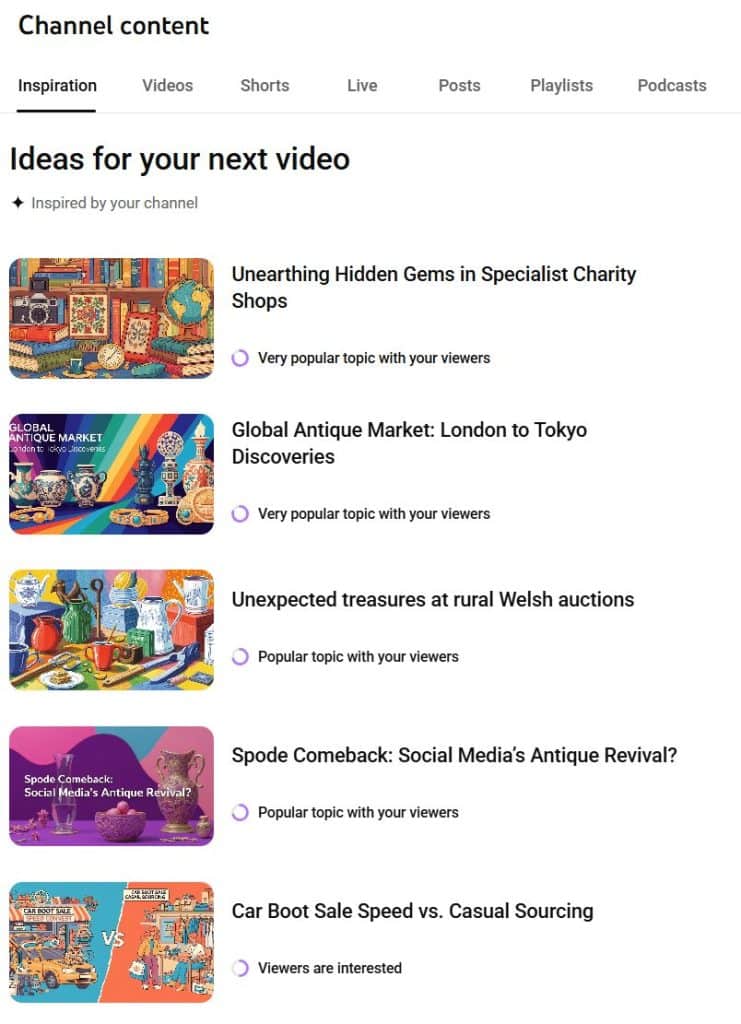 The screenshots I’ve included from YouTube Studio show these suggested topics coming directly from YouTube itself. This is important, because it means the system already knows who my viewers are — people who enjoy antiques, auctions, and collecting.