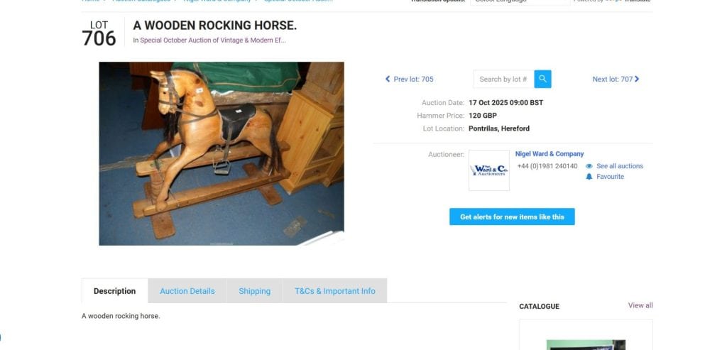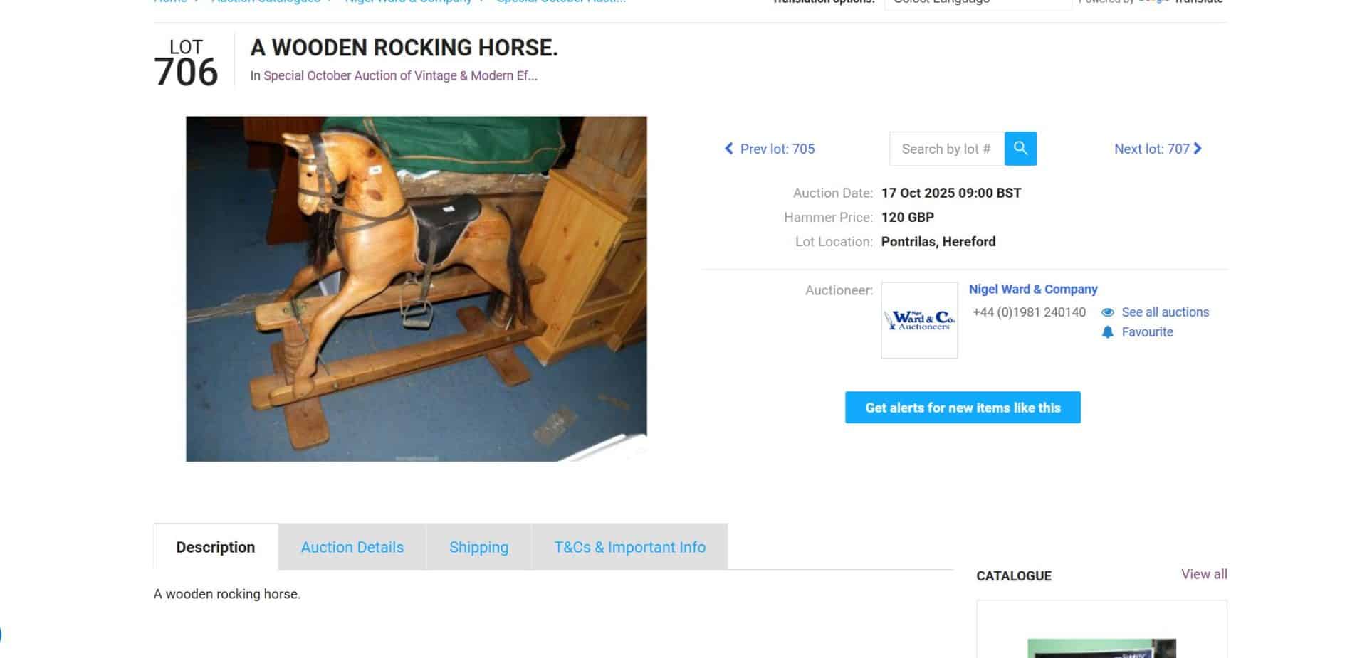 I purchased it for £150 and had been asking £300 at Malvern — a fair market value based on online comparisons. Yet it was listed only as “A rocking horse”, had no image until the day before the sale, no measurements, and was placed in the wrong (general) sale.