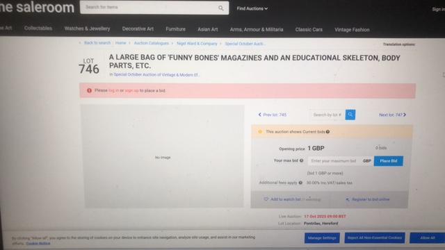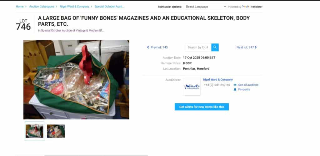 My Billy Bones anatomical models — which included almost two complete full-size skeletons — were listed only as “Funny Bones.” They sold for £8.
