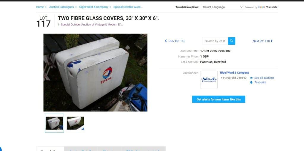 Incorrect and Incomplete Titles: Many titles bore no resemblance to those I provided. For instance, the petrol pump covers were entered simply as “two fibreglass covers” — even the auctioneer on the day was unsure what they were. They then sold for £1. If you had added a petrol station, gas pump anything in the title, they would have been picked up by collectors, as people have alerts set up for this kind of thing.