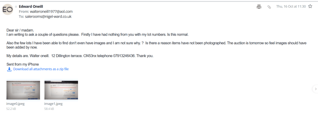 I emailed Nigel Ward & Co. immediately to ask why my items had no images. At that point, I still didn’t think anything was seriously wrong. The catalogue contained a mix of beautiful items — silver, gold, paperweights, and other antiques — so I assumed my pieces were included in the same sale.