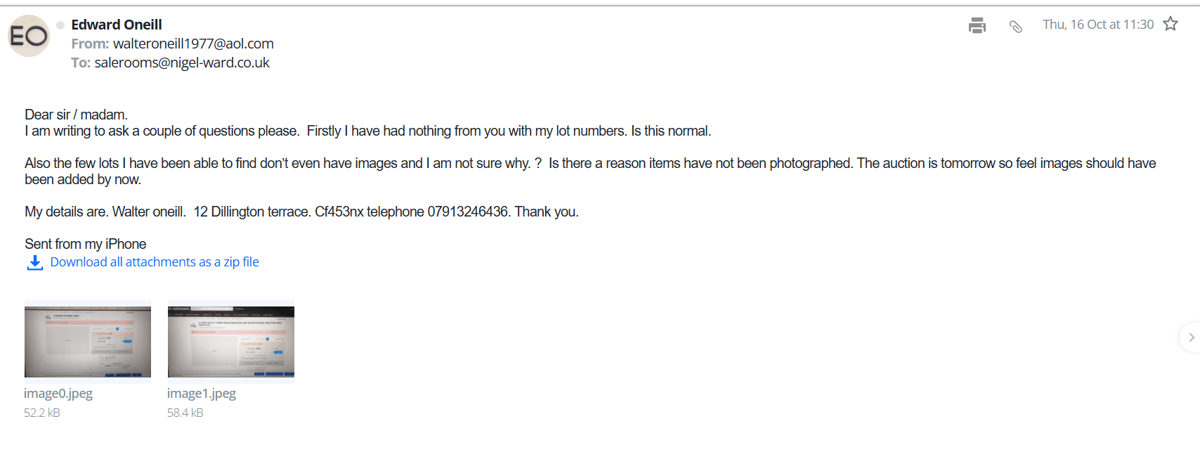 Missing Images: When the online catalogue first went live, none of my items displayed images. I had to email repeatedly before any appeared — and even then, some were uploaded less than 24 hours before the sale.