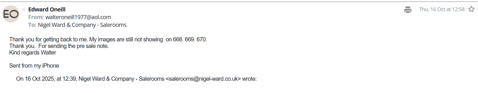 Finally, communication is everything. Vendors should receive clear pre-sale advice in good time, with a chance to approve listings or correct mistakes. That’s basic professionalism and courtesy. In my case, the catalogue went live without images, titles were wrong, and the pre-sale advice didn’t arrive until the eve of the auction — leaving me no chance to intervene.