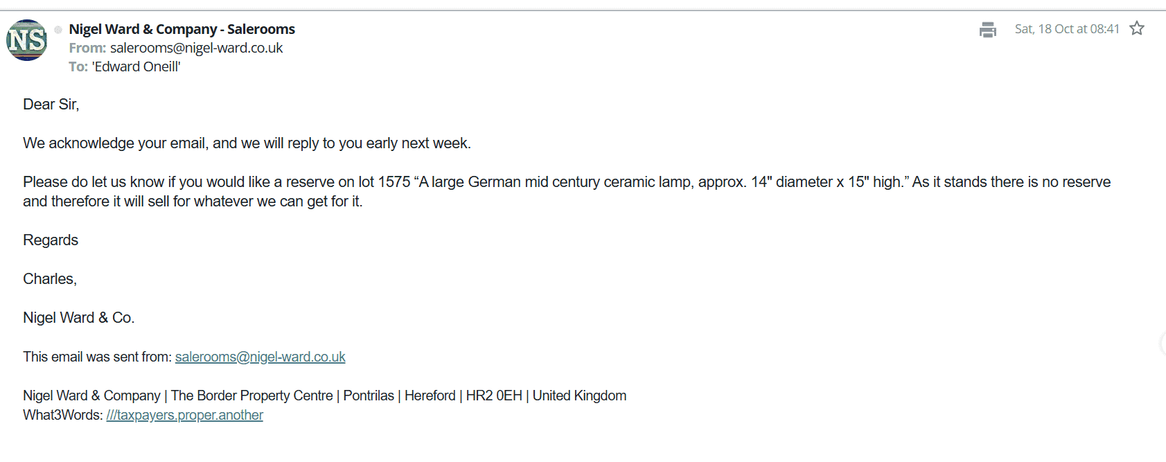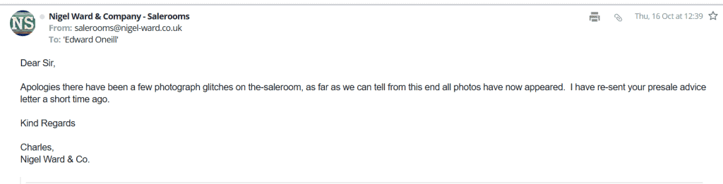 When the online catalogue first went live on The Saleroom, none of my items had images attached. I emailed Nigel Ward & Co. to raise the issue, and although they apologised and claimed there had been a “glitch,” most images were still missing well into the following day.