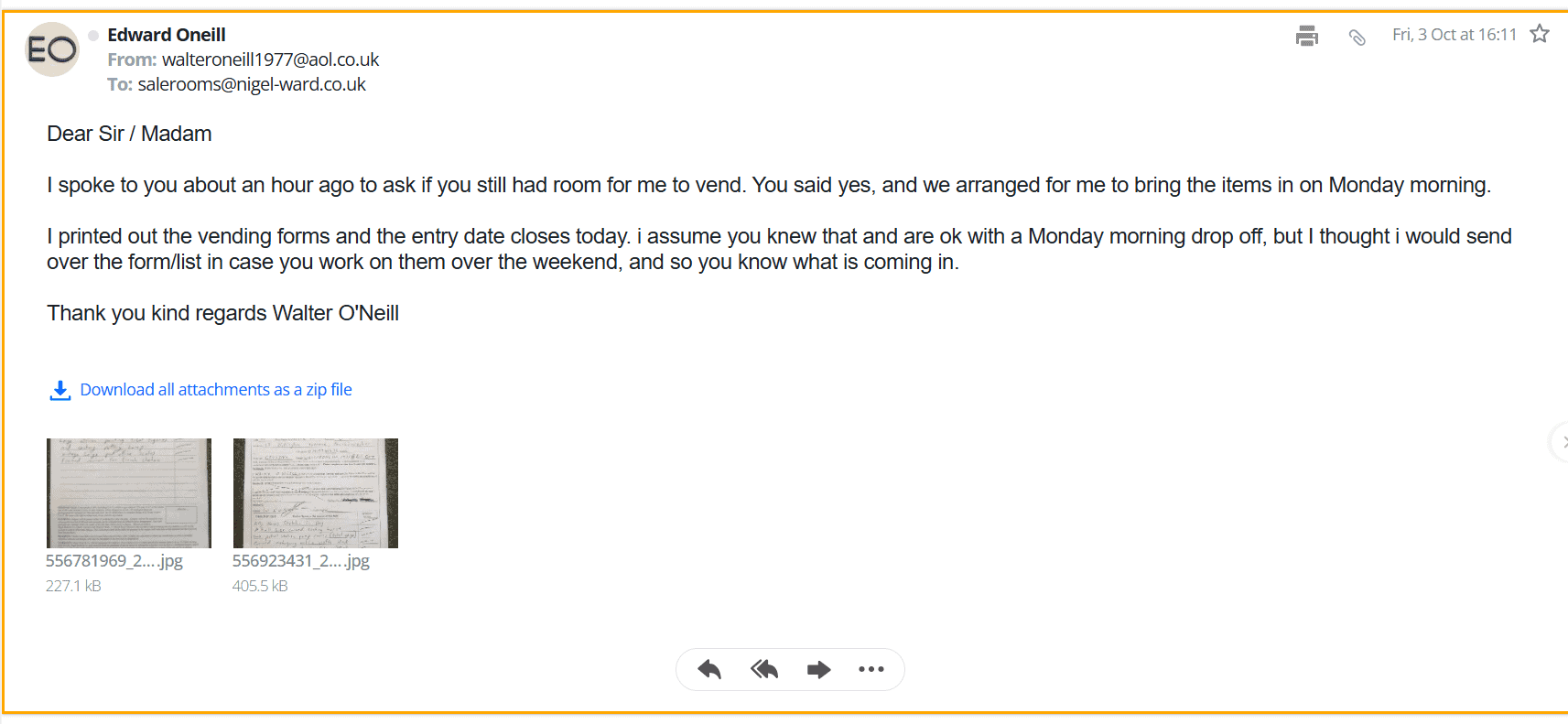 With that paperwork in mind, I went ahead and delivered the items as agreed, confident that they were being entered into the correct antiques sale.