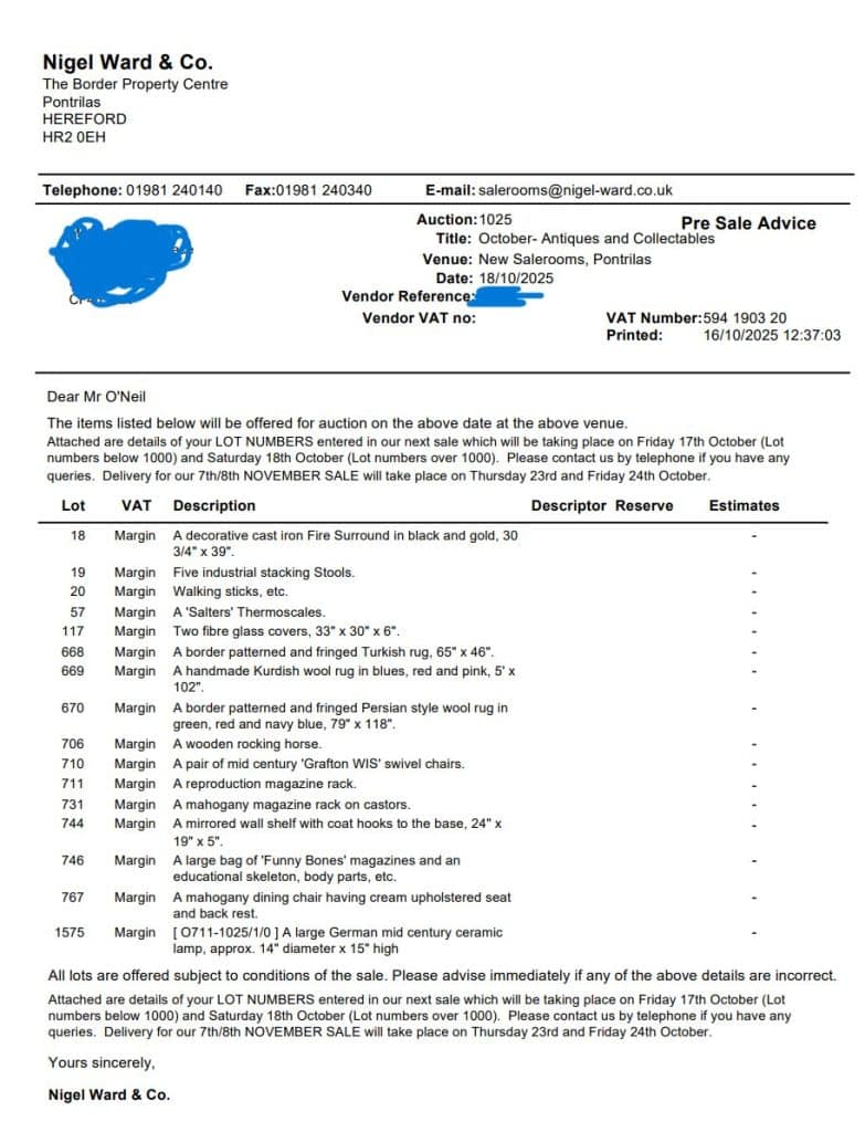 I was told my items would be entered into the antiques sale, yet every single lot was instead placed into the general house-clearance sale — the one normally used for low-value household goods and farm clearances.
