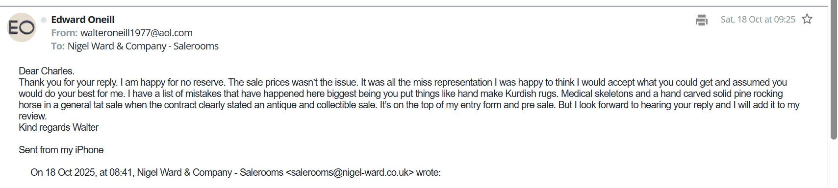 That said, I felt the handling of this particular sale raised enough concerns to justify a formal complaint. My intention isn’t to start a dispute, but to document the facts clearly and give Nigel Ward & Co. the opportunity to respond directly.
