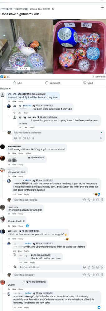 One particular post immediately stood out to me because it featured two lots I had previously placed bids on — and later withdrawn — from Nigel Ward & Co. The image showed the paperweights stacked together in plastic trays, and the buyer was expressing concern about how their items were handled and presented upon collection. Several group members responded with similar surprise or disappointment.