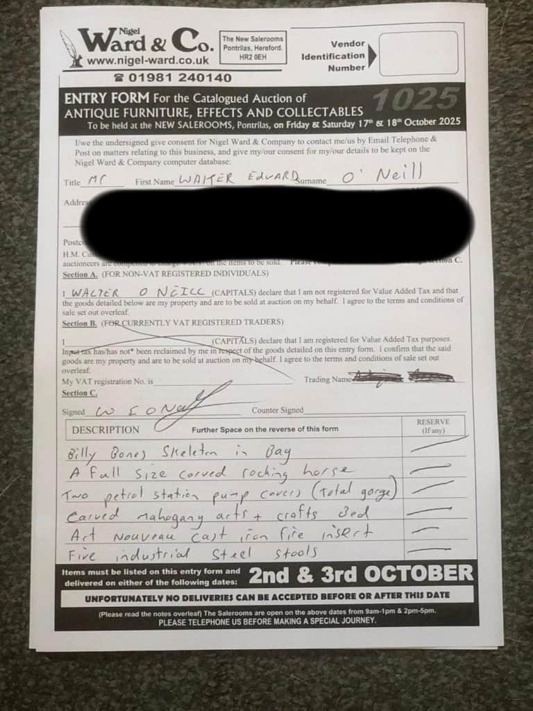 “Entry Form for the Catalogued Auction of Antique Furniture, Effects and Collectables – to be held on Friday & Saturday 17th & 18th October 2025.”