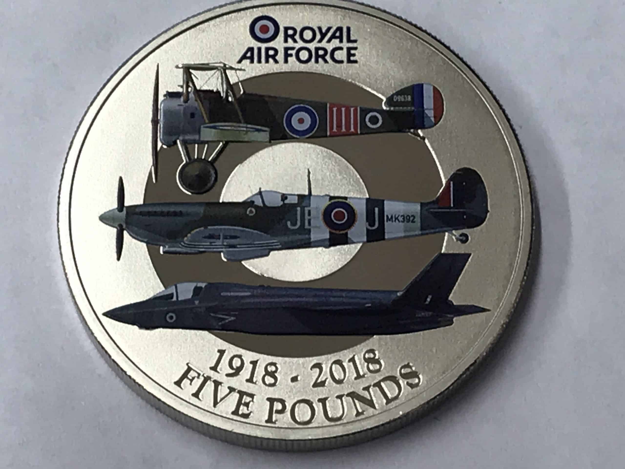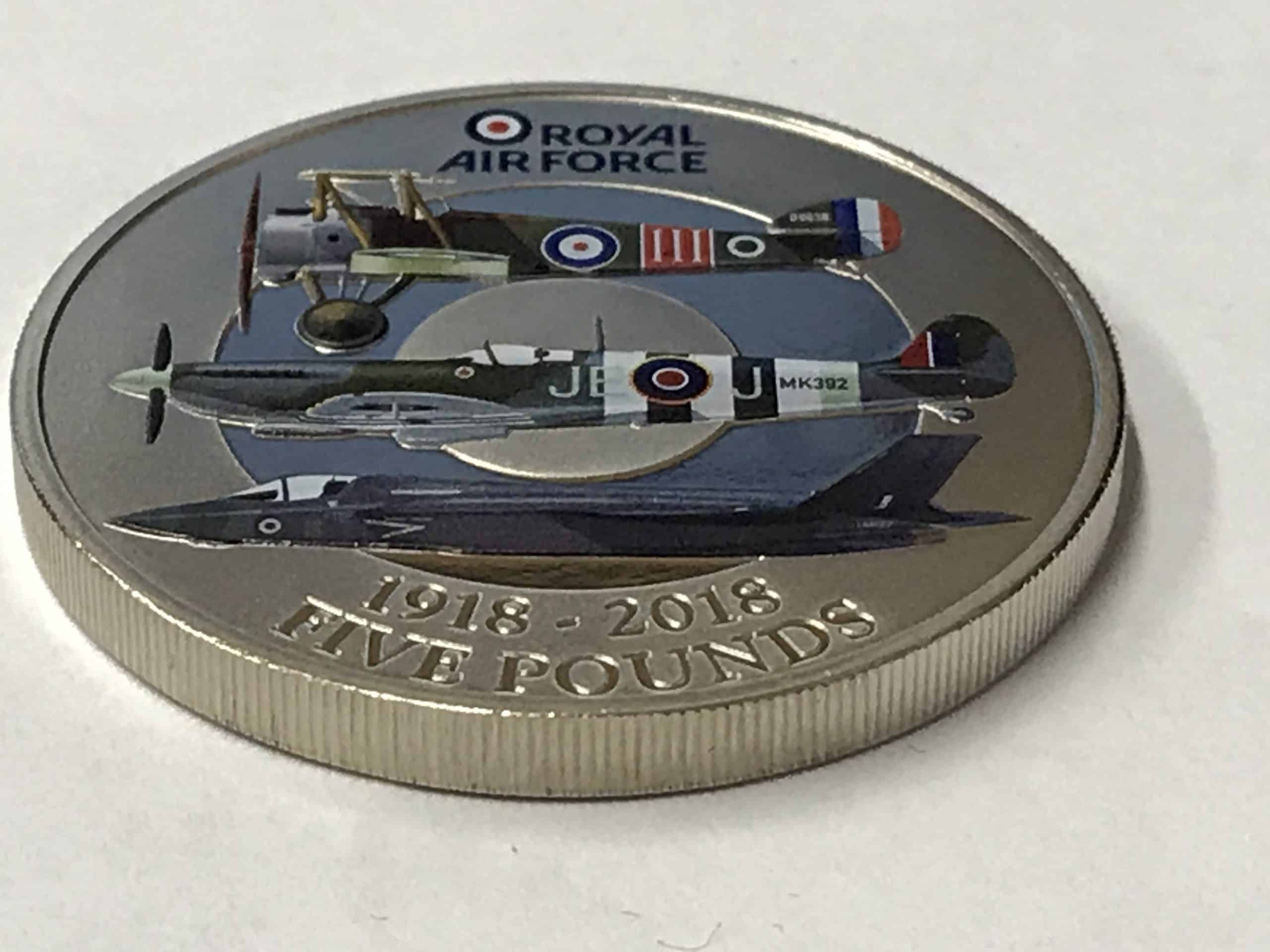 On offer is a 2018 Royal Air Force Centenary £5 coin, issued by Jersey to commemorate the RAF’s 100th anniversary (1918–2018). The reverse features full-colour depictions of three iconic RAF aircraft across different eras, while the obverse carries the portrait of Queen Elizabeth II.