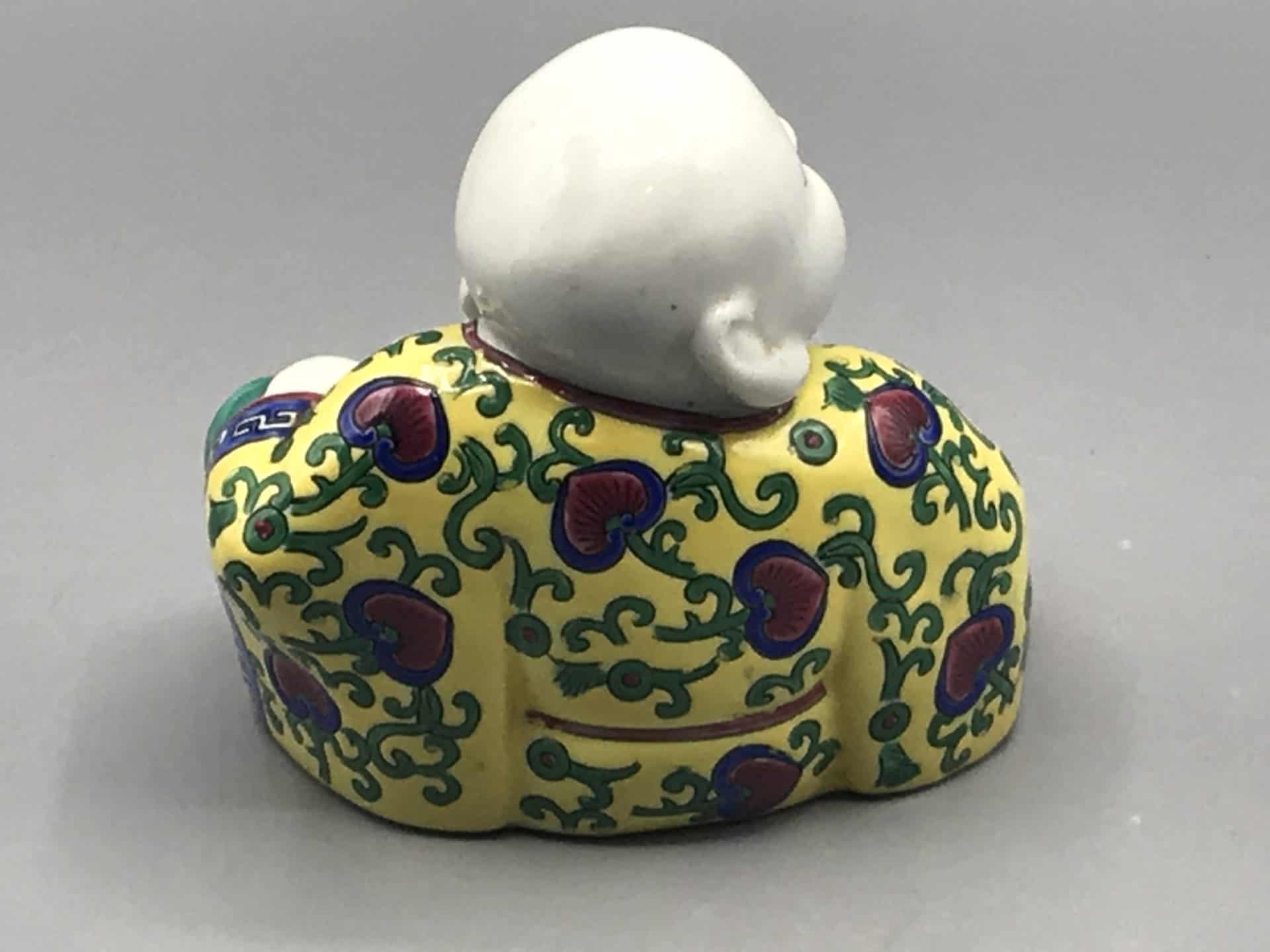 This figure reflects the long tradition of famille rose (fencai) porcelain, first popularized in the Qing Dynasty (18th century) and continued through the Republic Period and into the 20th century. Figures of children and Buddhas were auspicious motifs, representing prosperity, happiness, and protection. While unmarked, the quality of enameling and form suggest production in Jingdezhen, China’s renowned porcelain hub.