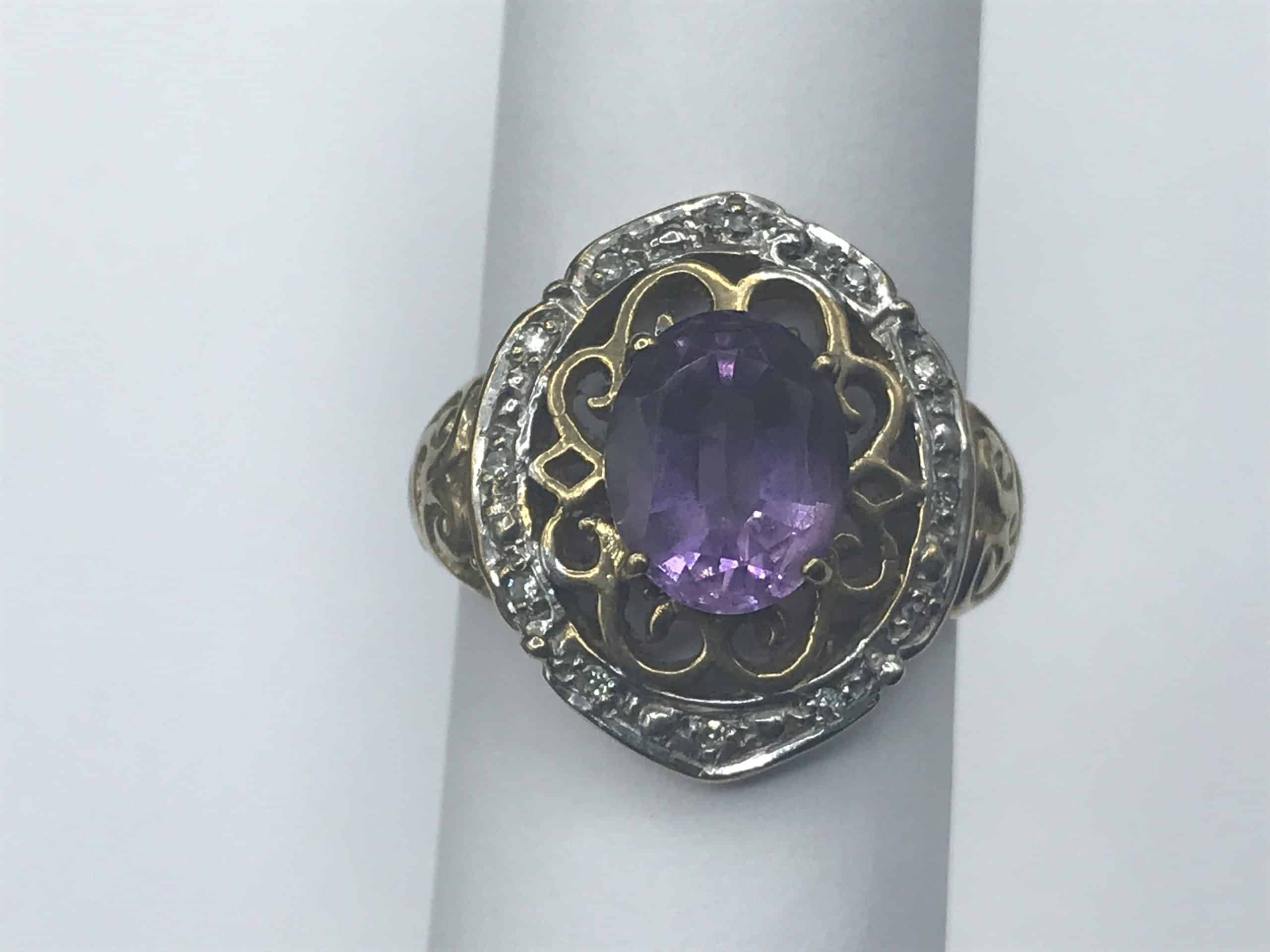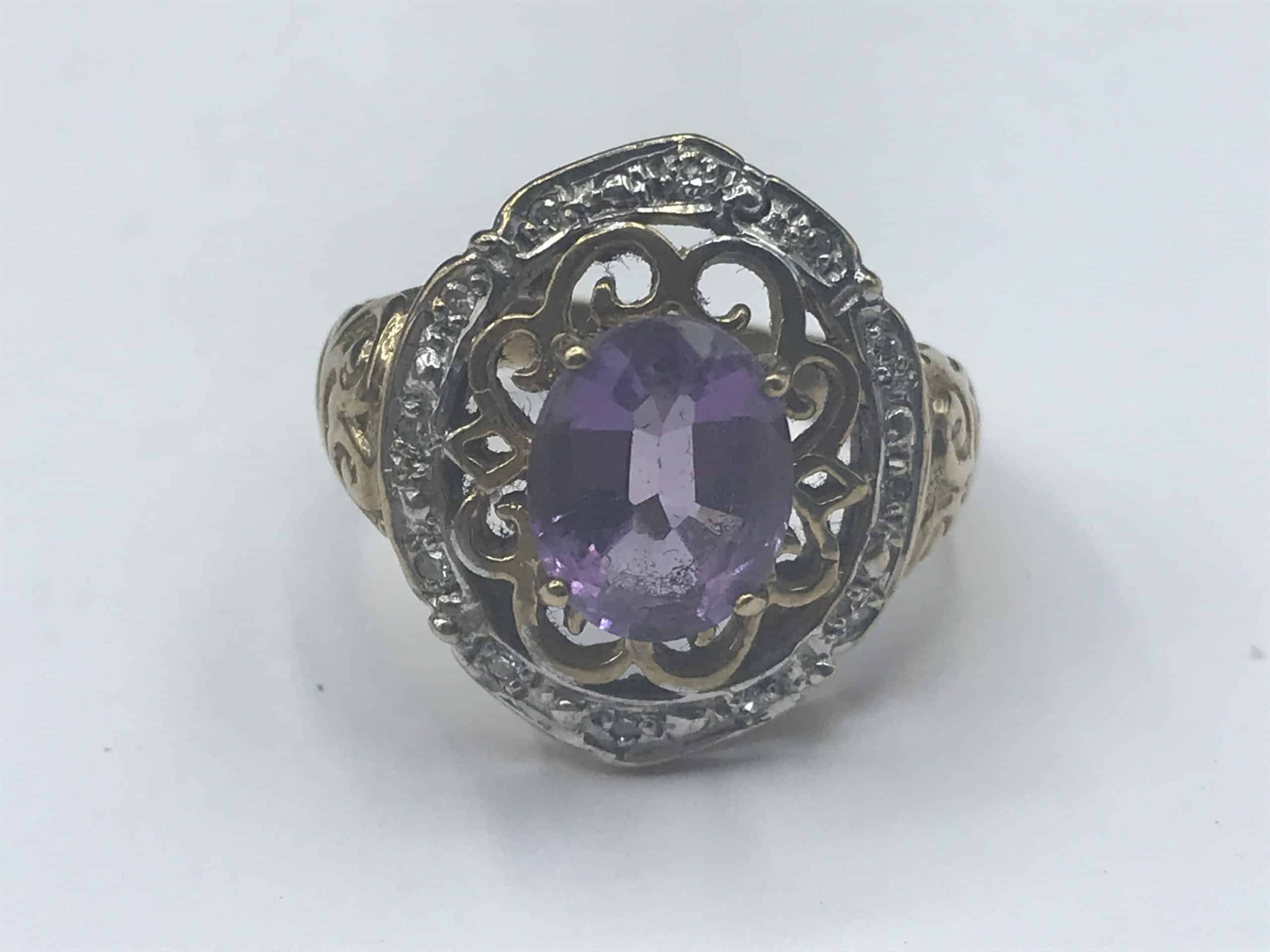 Indulge in the beauty of this stunning vintage 9ct gold ring, set with a large, vibrant amethyst surrounded by dazzling diamond accents. Designed with intricate filigree work and a timeless elegance, this ring is a true showpiece.