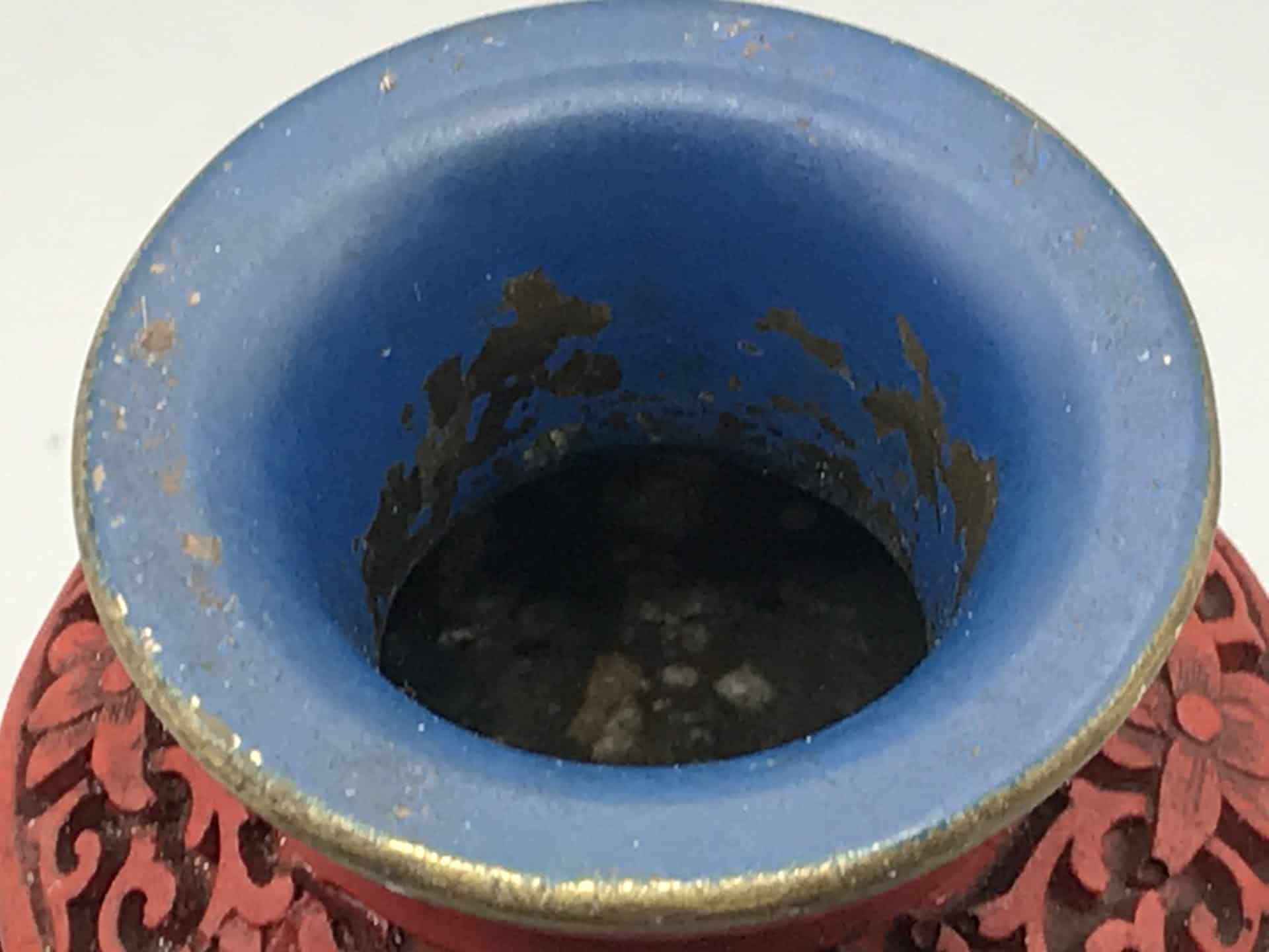 Expertly hand-carved from deep red cinnabar lacquer, this vase features a sinuous five-clawed dragon among stylized clouds, framed by traditional lotus-scroll borders. The interior and base are finished in rich cobalt blue enamel, encircled by a gilt rim — a classic detail of Chinese export wares.