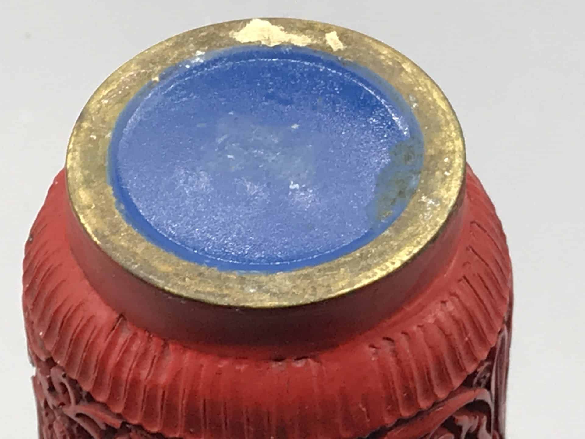 This type of cinnabar work, with carved lacquer over a brass base and finished with blue enamel, was popular in the late Qing and early Republic era. The dragon, often five-clawed, represents imperial authority, strength, and protection. The swirling clouds surrounding it symbolize heavenly realms and divine power.