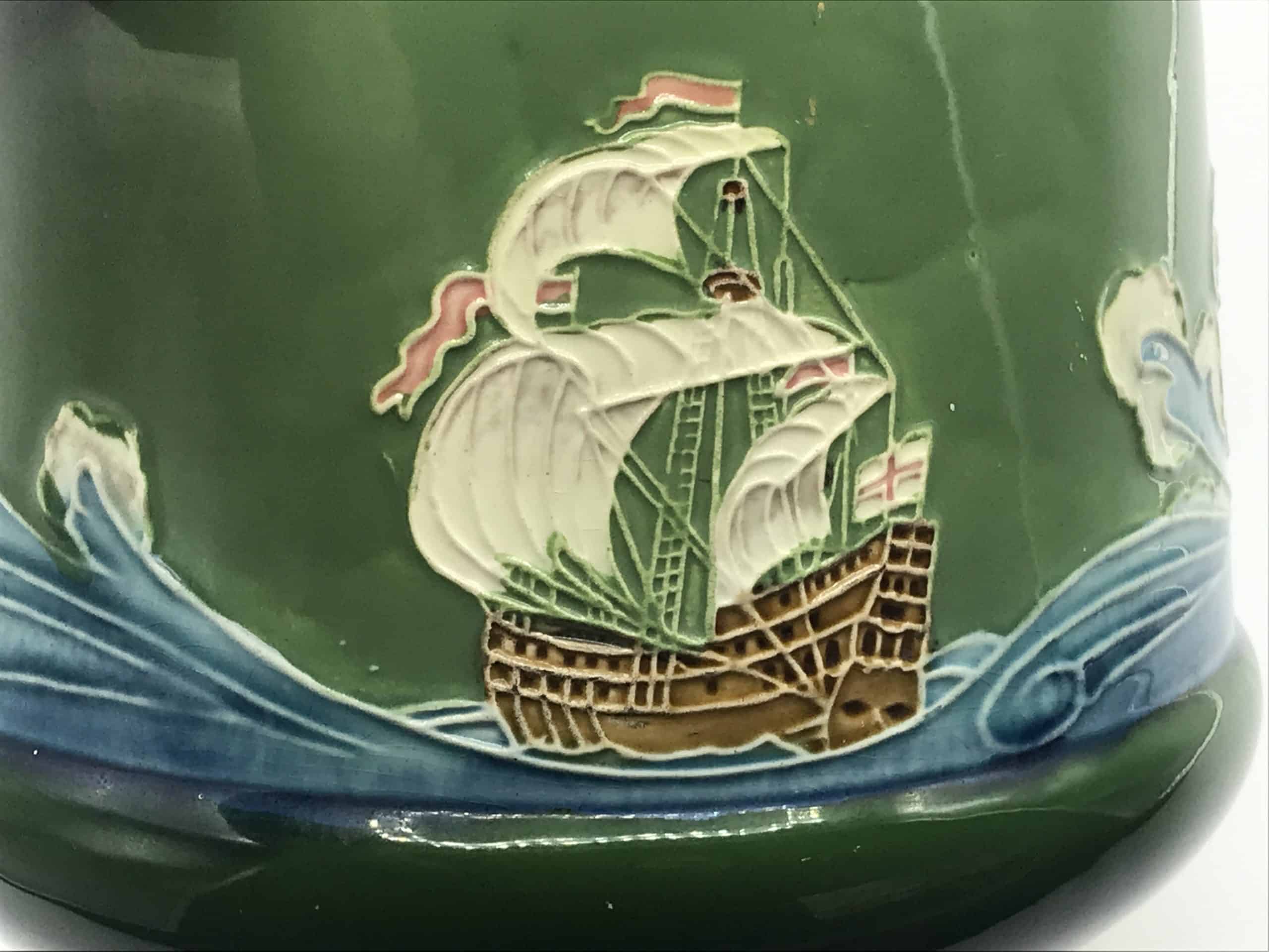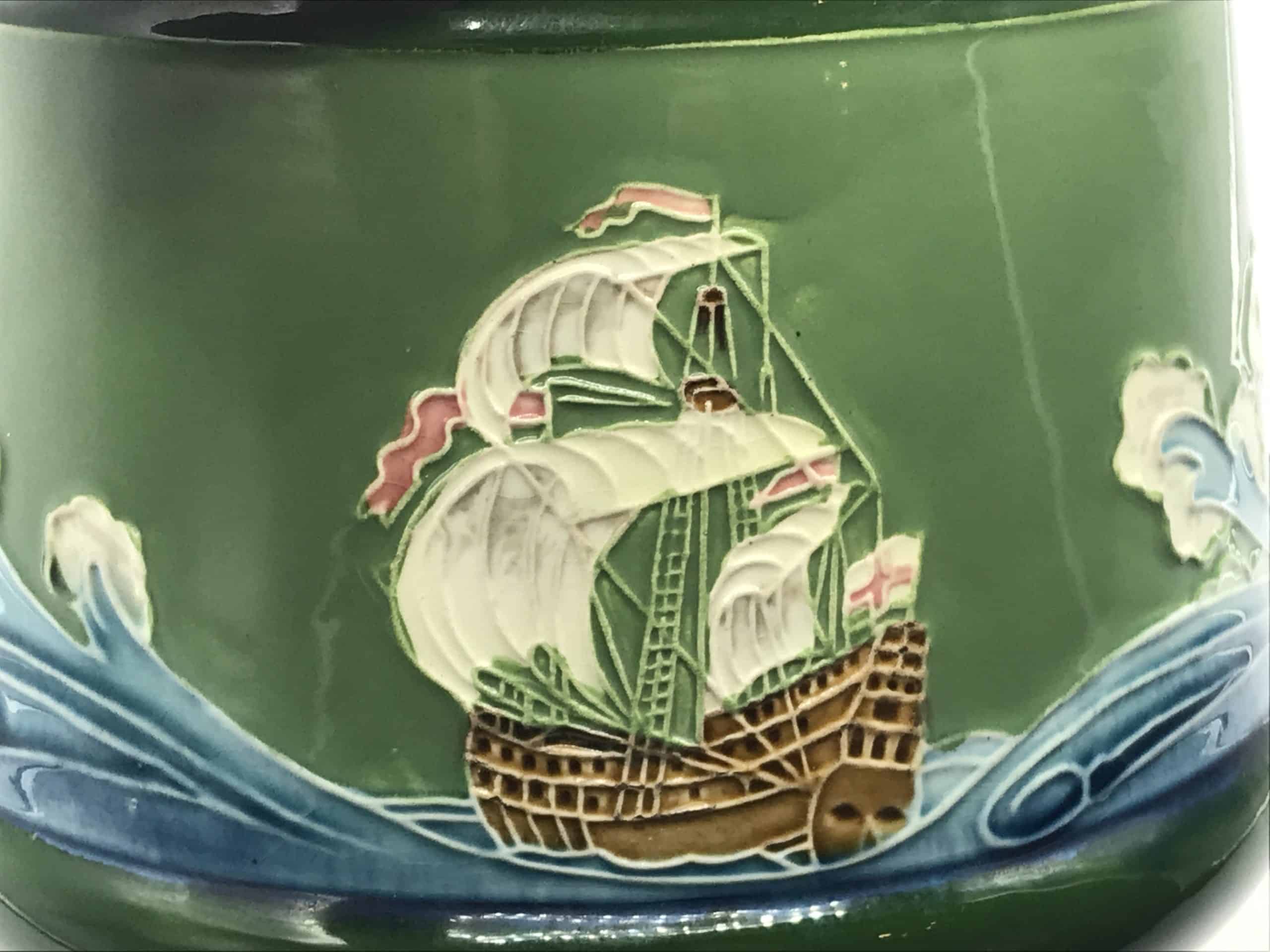 ✅ Tube-lined majolica decoration – Nautical sailing ship & ocean waves