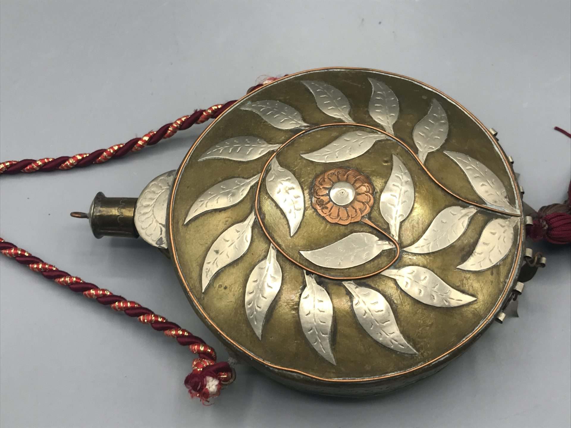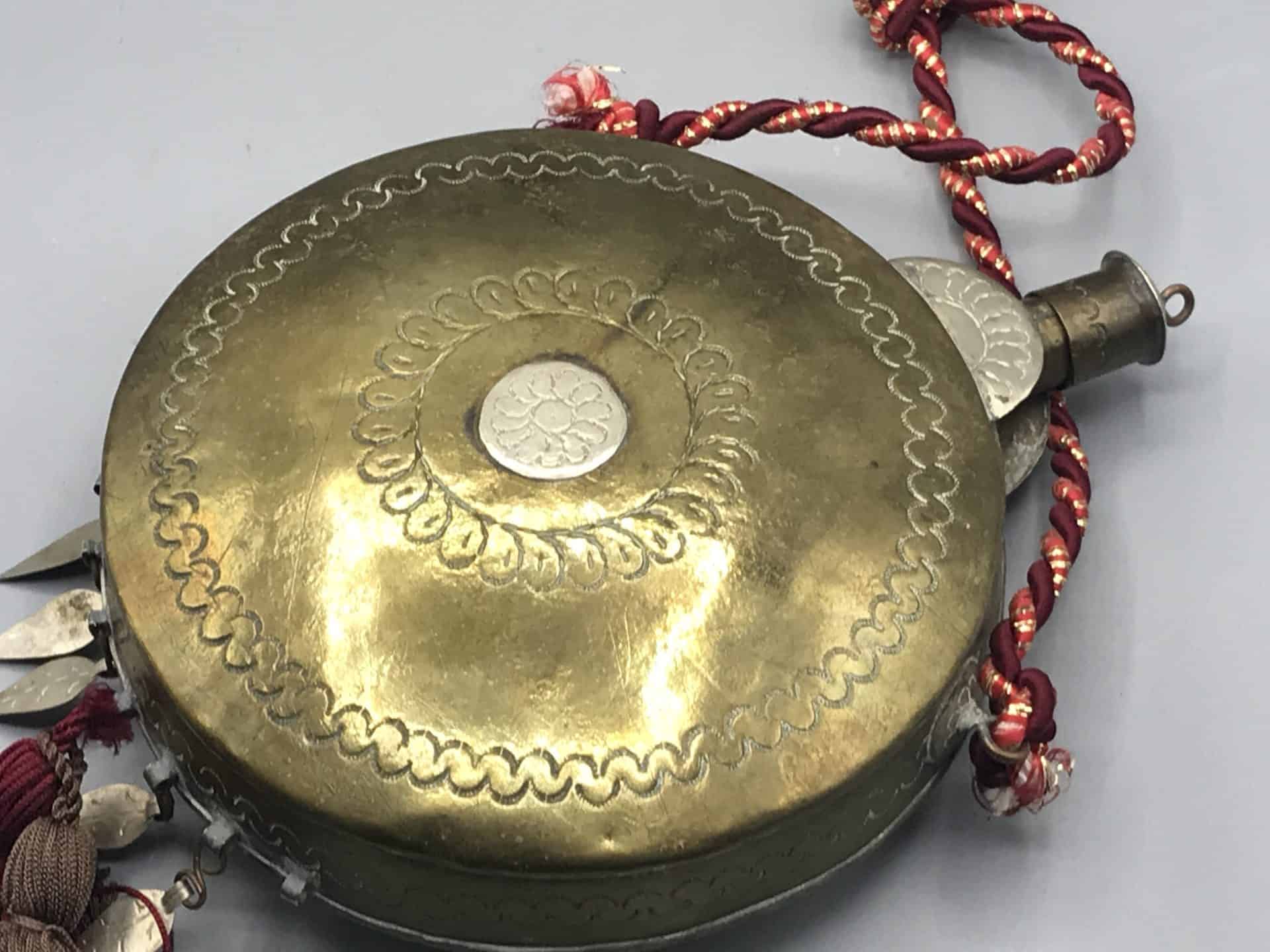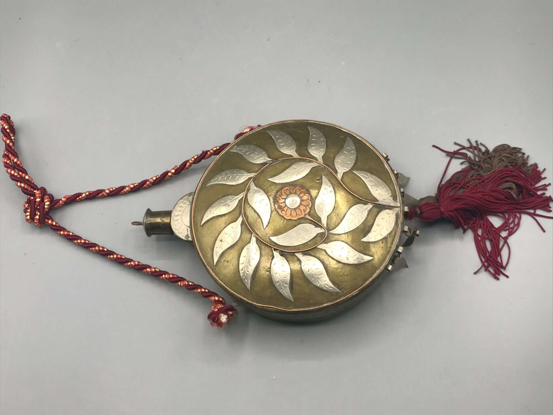 Antique Brass Moroccan Cantimplora Flask with Silver & Copper Inlay – Islamic Powder Flask
