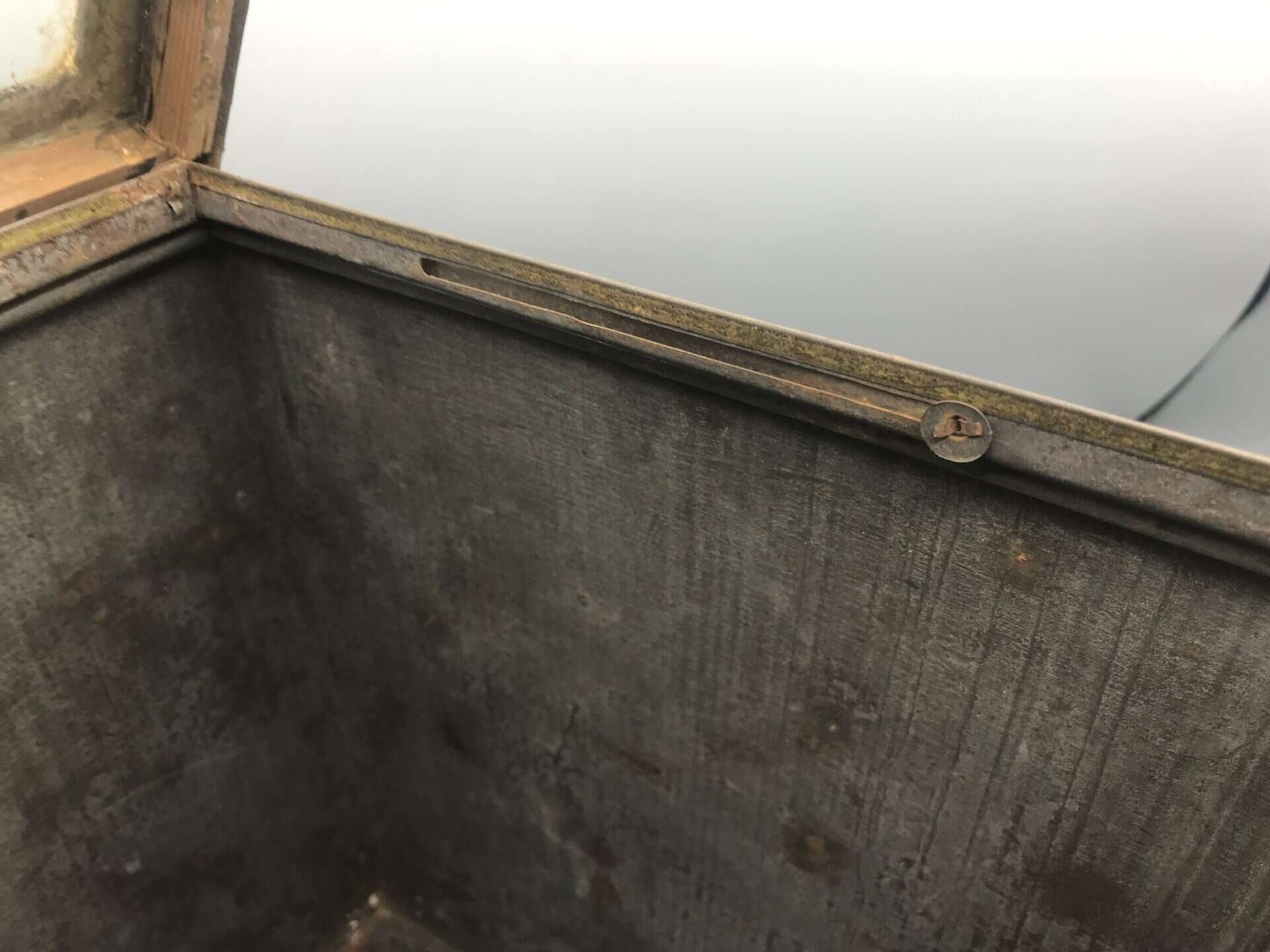 ✅ Condition: Wear and patina consistent with age and use; one lid support bracket missing, rusting and loss to surfaces, aged paper label remains visible; glass intact
