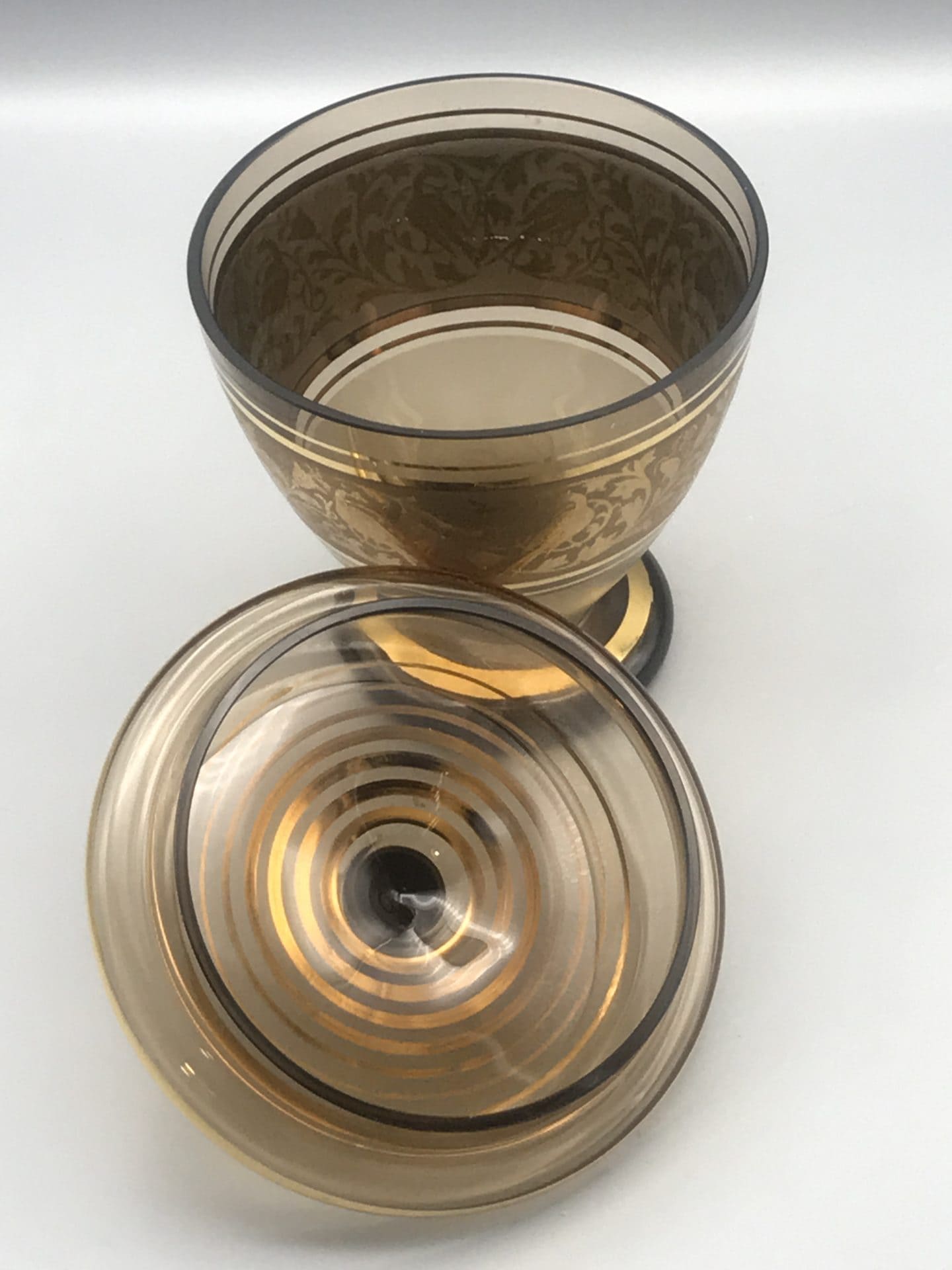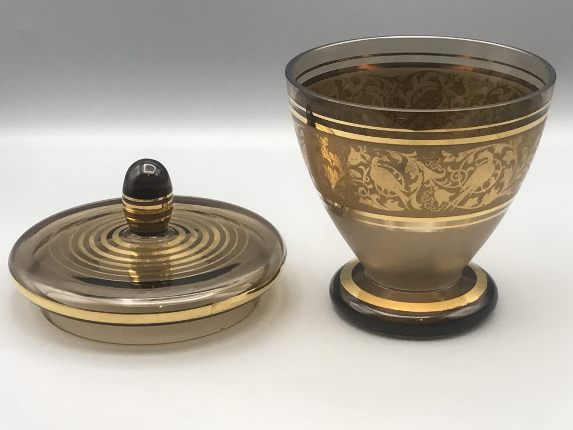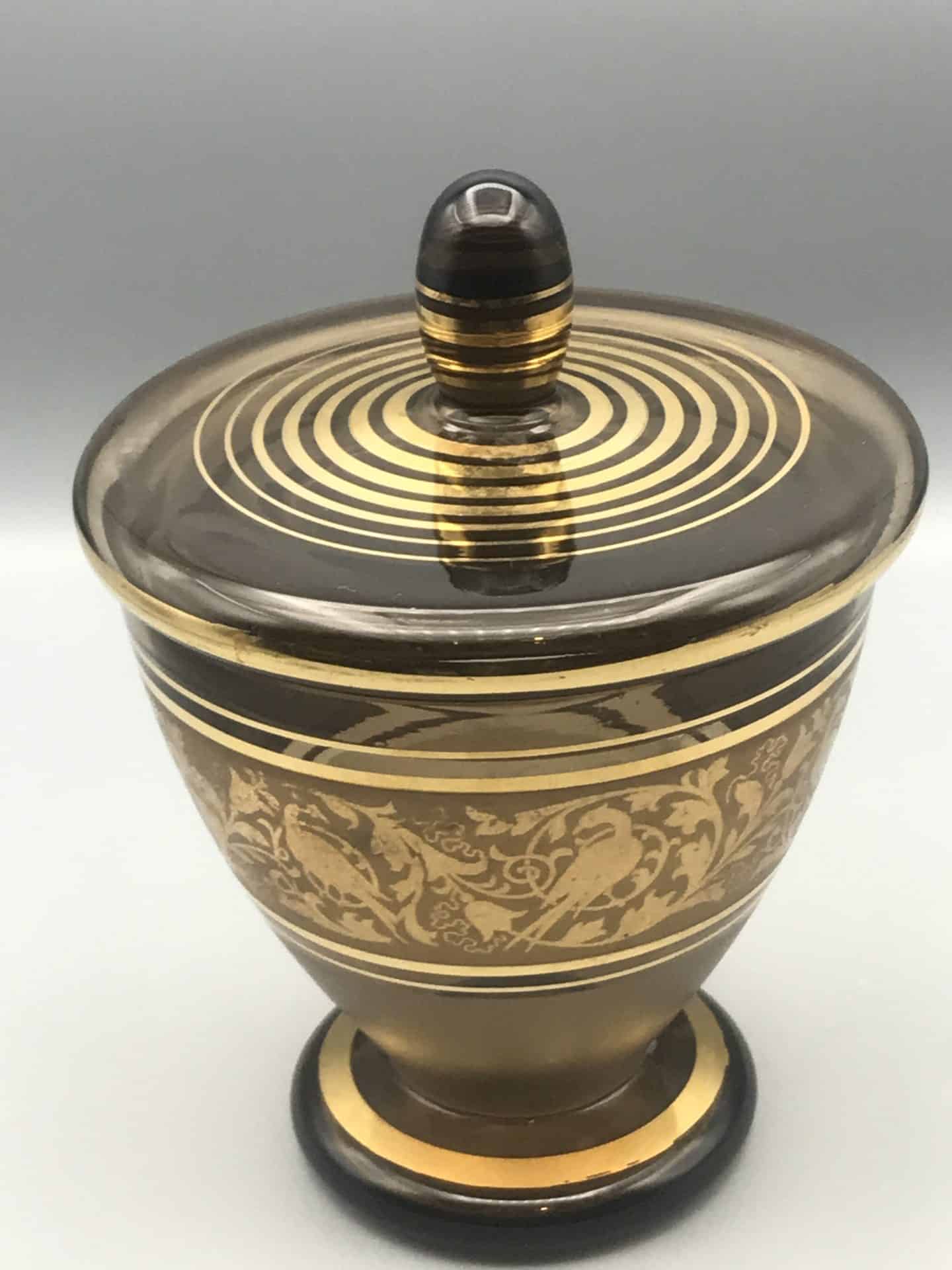 Smoky Glass Lidded Dish with Gold Encrusted Bird Motif – Bohemia Crystal