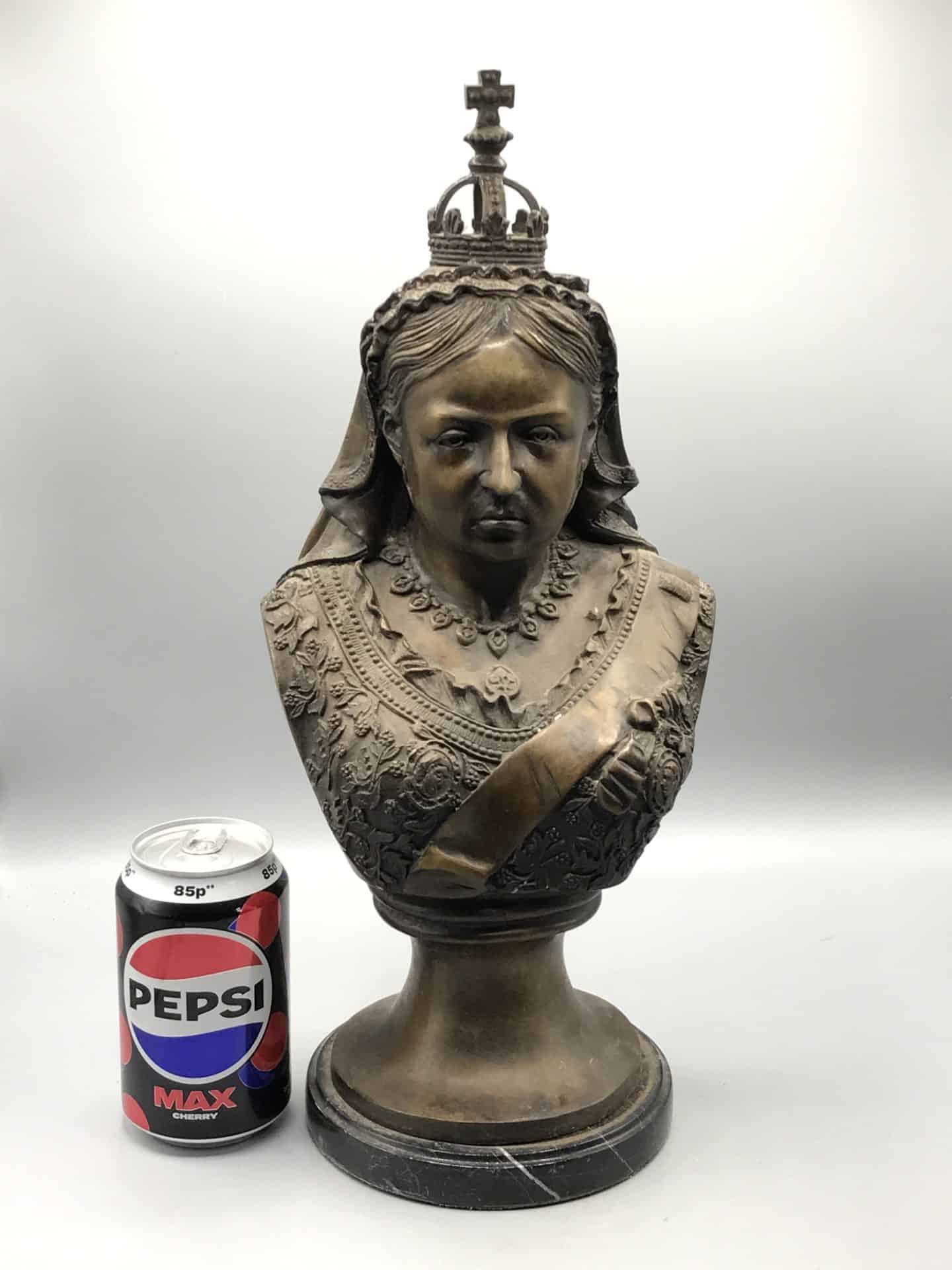 On offer is a spectacular bronze bust of Queen Victoria, beautifully cast in fine detail and mounted on a solid marble plinth. This striking piece celebrates Britain’s longest-reigning monarch of the 19th century, capturing her iconic image with a deeply expressive likeness, elaborate dress, and regal crown.