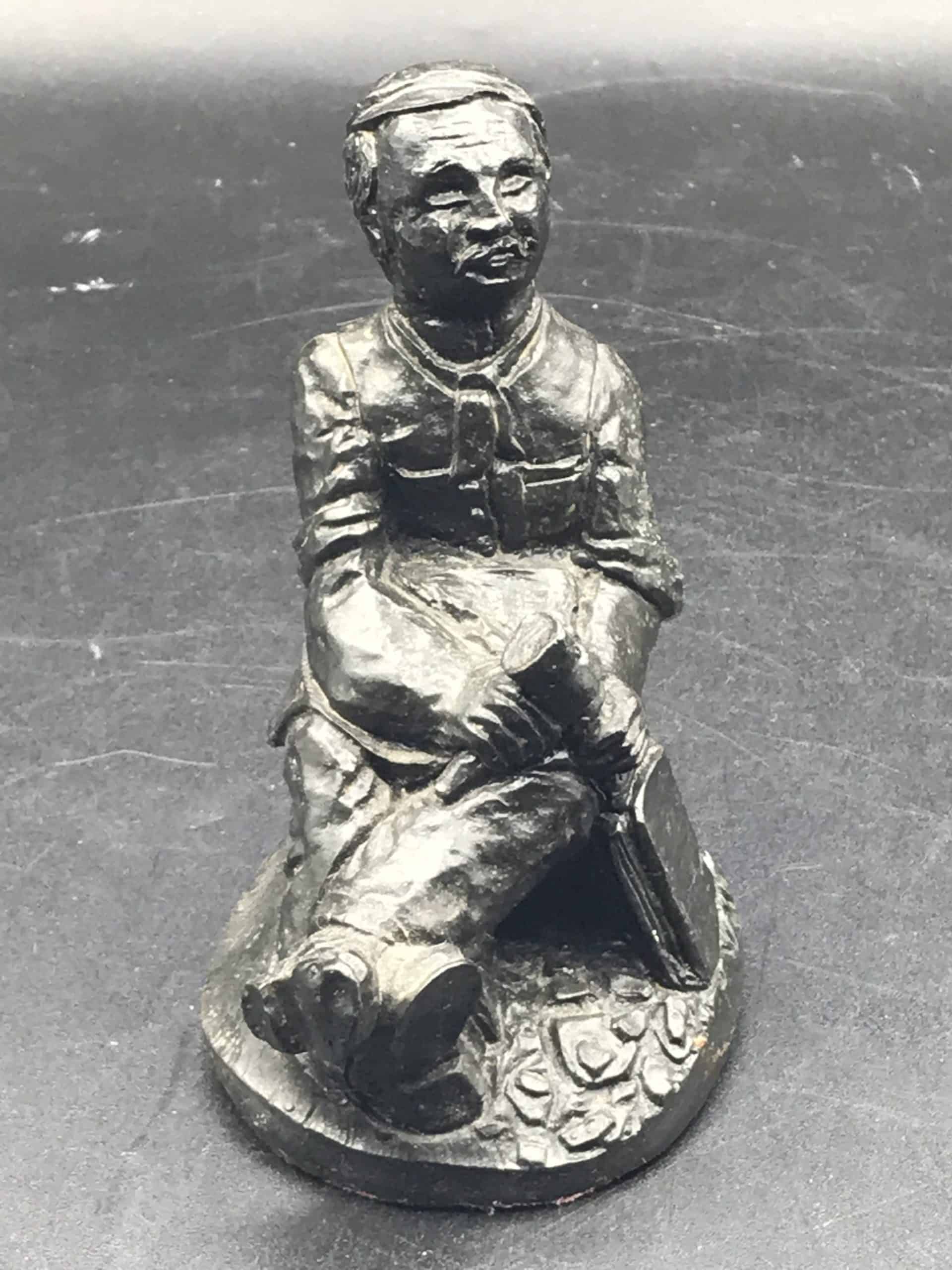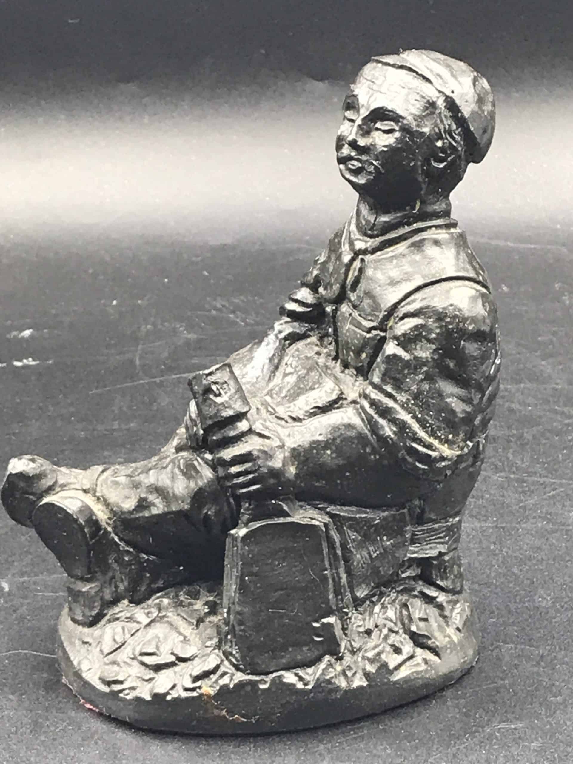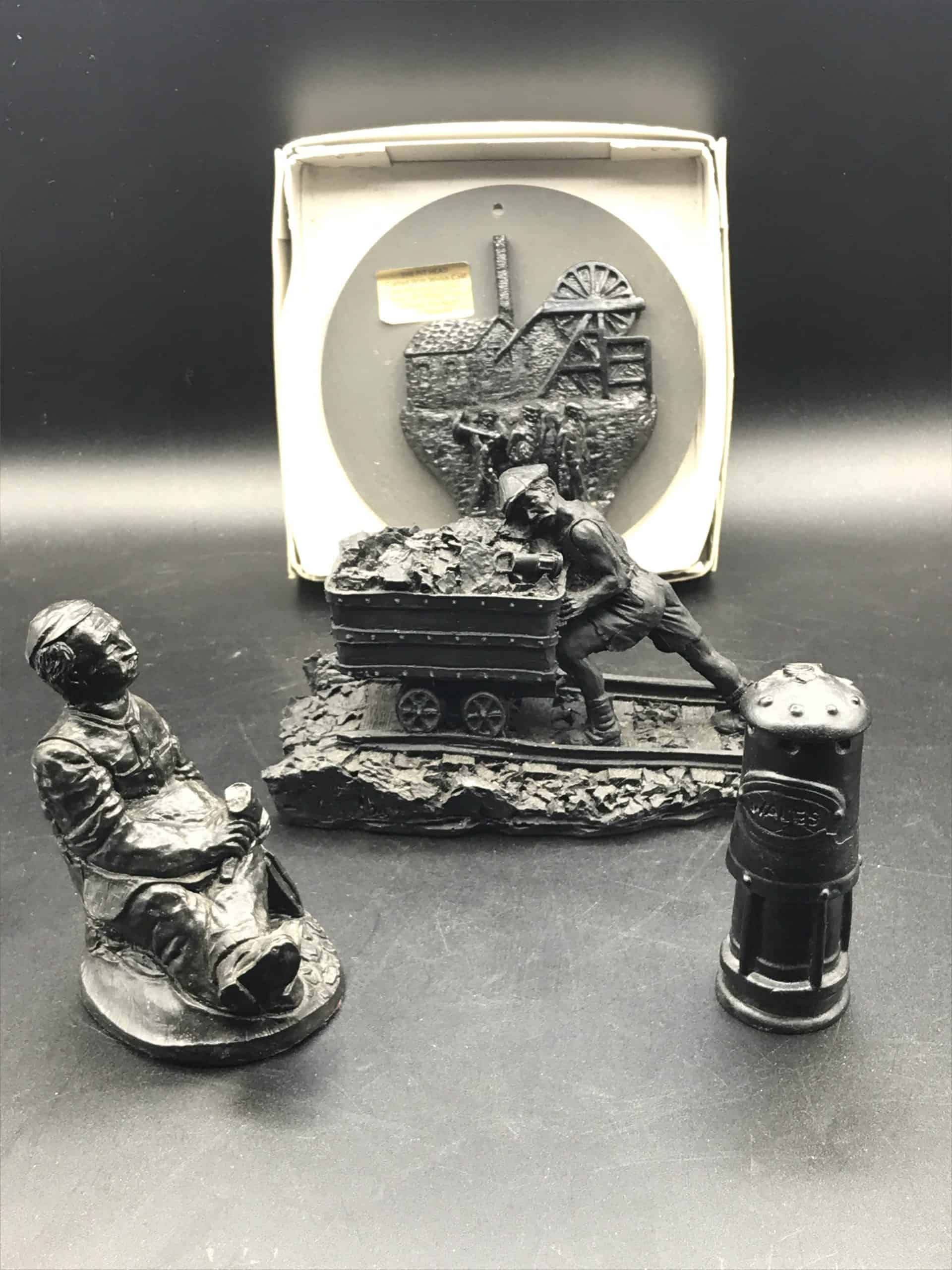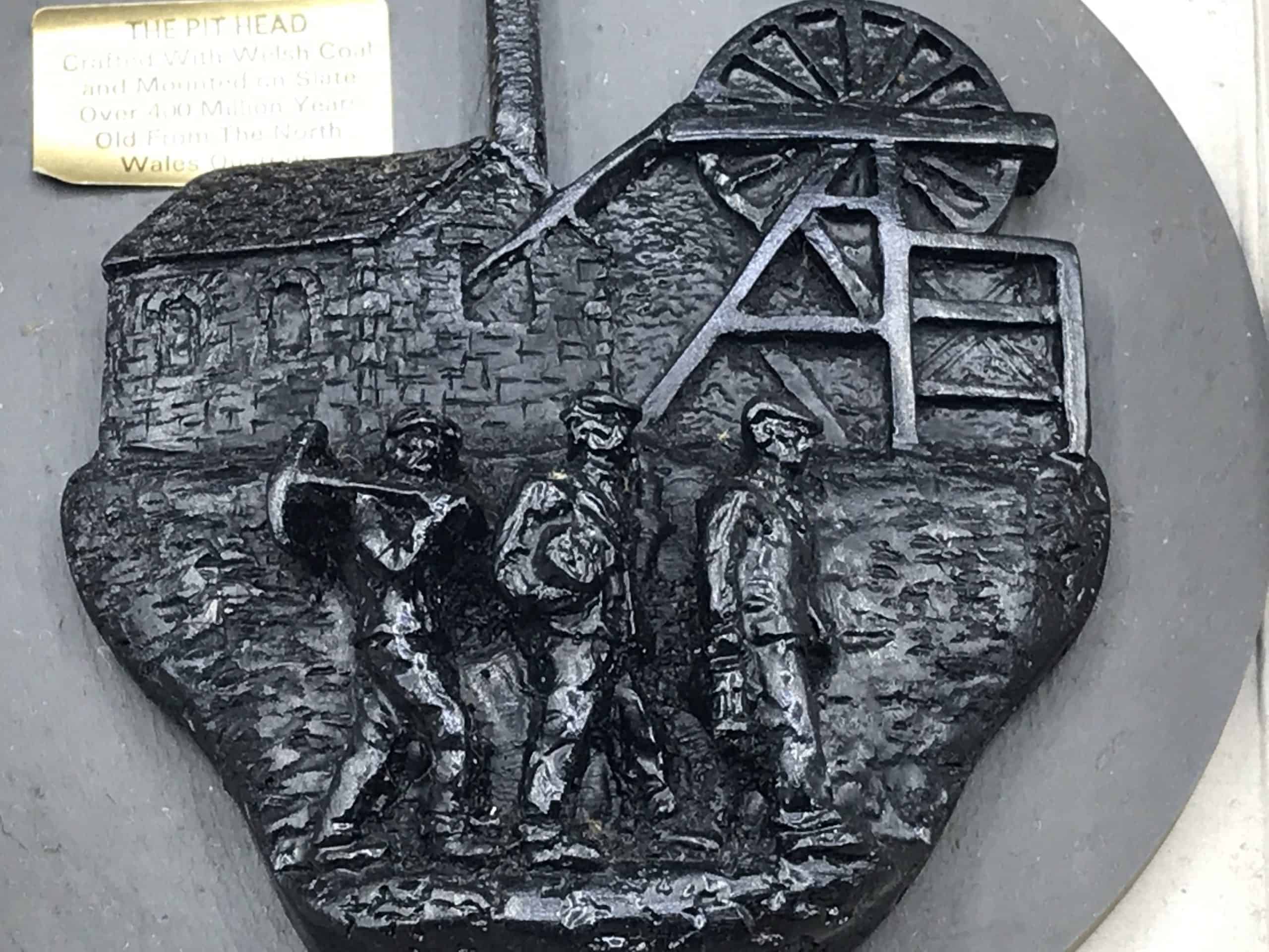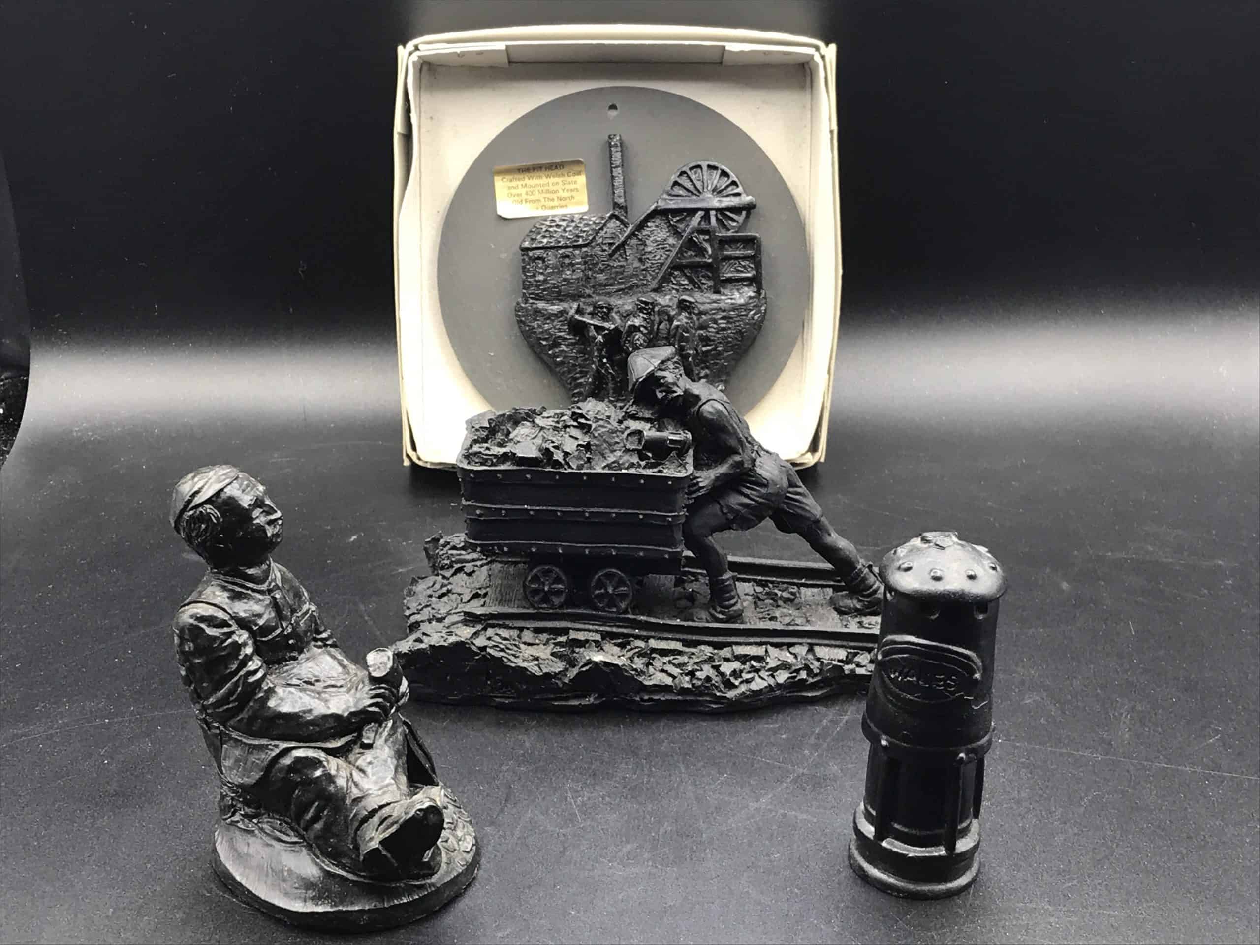 On offer here is a superb group of welsh mining memorabilia. Each piece has been crafted out of welsh coal and the one-piece has been mounted on a 400 million-year-old welsh slate. there is an amazing selection here all depicting Welsh mining history, firstly we have a beautiful miner’s safety lamp,size approx 4.25 inches tall. next, you have a miner pushing a cart full of coal with his miner’s lamp on the top of the coal, size of this one is approx 7.5 inches long 4 inches high. Next, you have a miner sat down he stands at approx 4.5 inches tall and finally we have the Pithead with three miners in front of a winding wheel mounted on a slate mined from the north wales quarries, the size of this one is 6.25 inches in diameter. All these portray a wonderful story of hard-working Welsh miners. the condition is good with wear commensurate to age and use.
