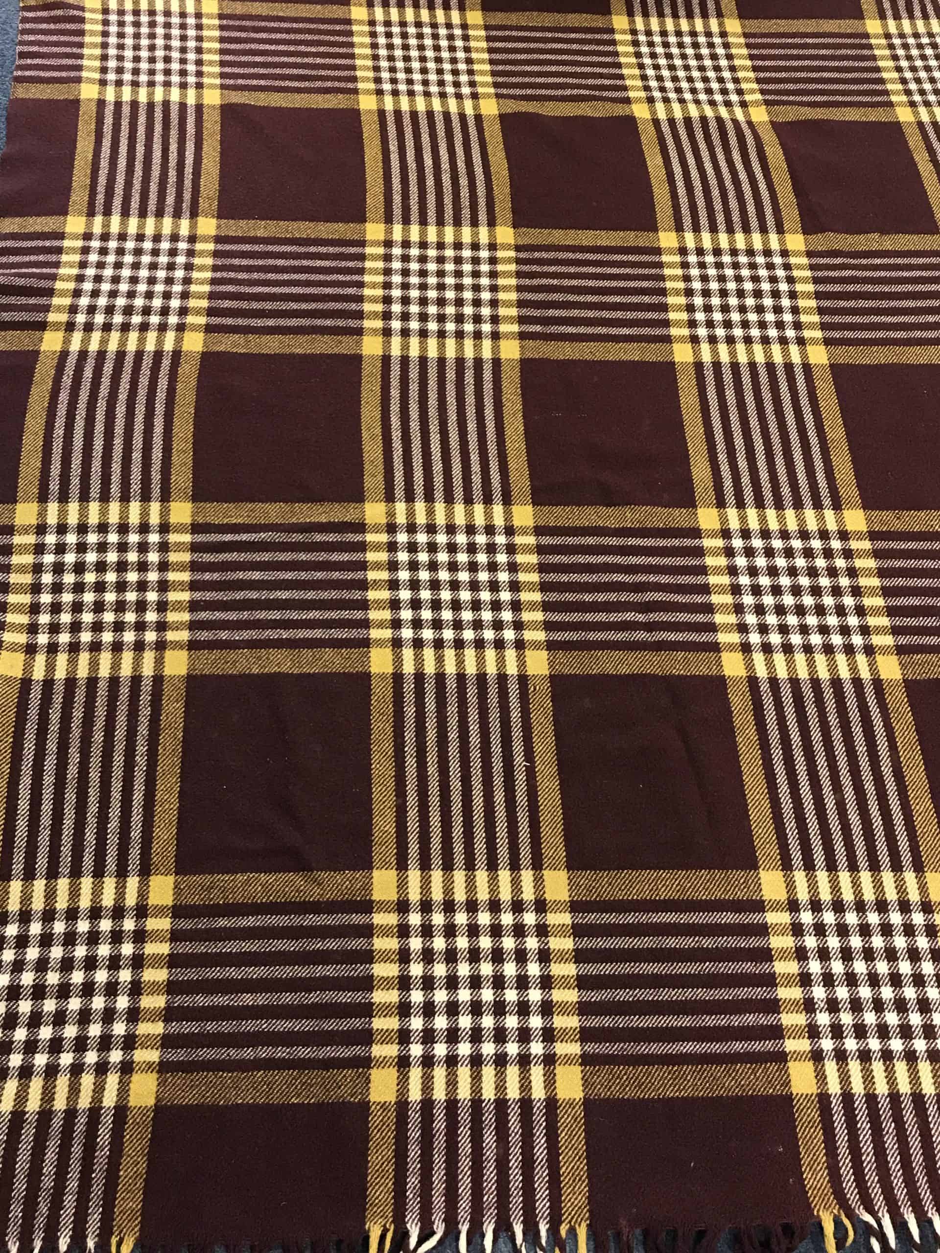 On offer is a beautiful and high-quality vintage Isle of Man Manx wool travelling rug, featuring a classic plaid tartan design in rich purple, yellow, and white tones. This authentic wool blanket is made from thick, warm, and durable Manx wool, a material celebrated for its superior insulation and softness.