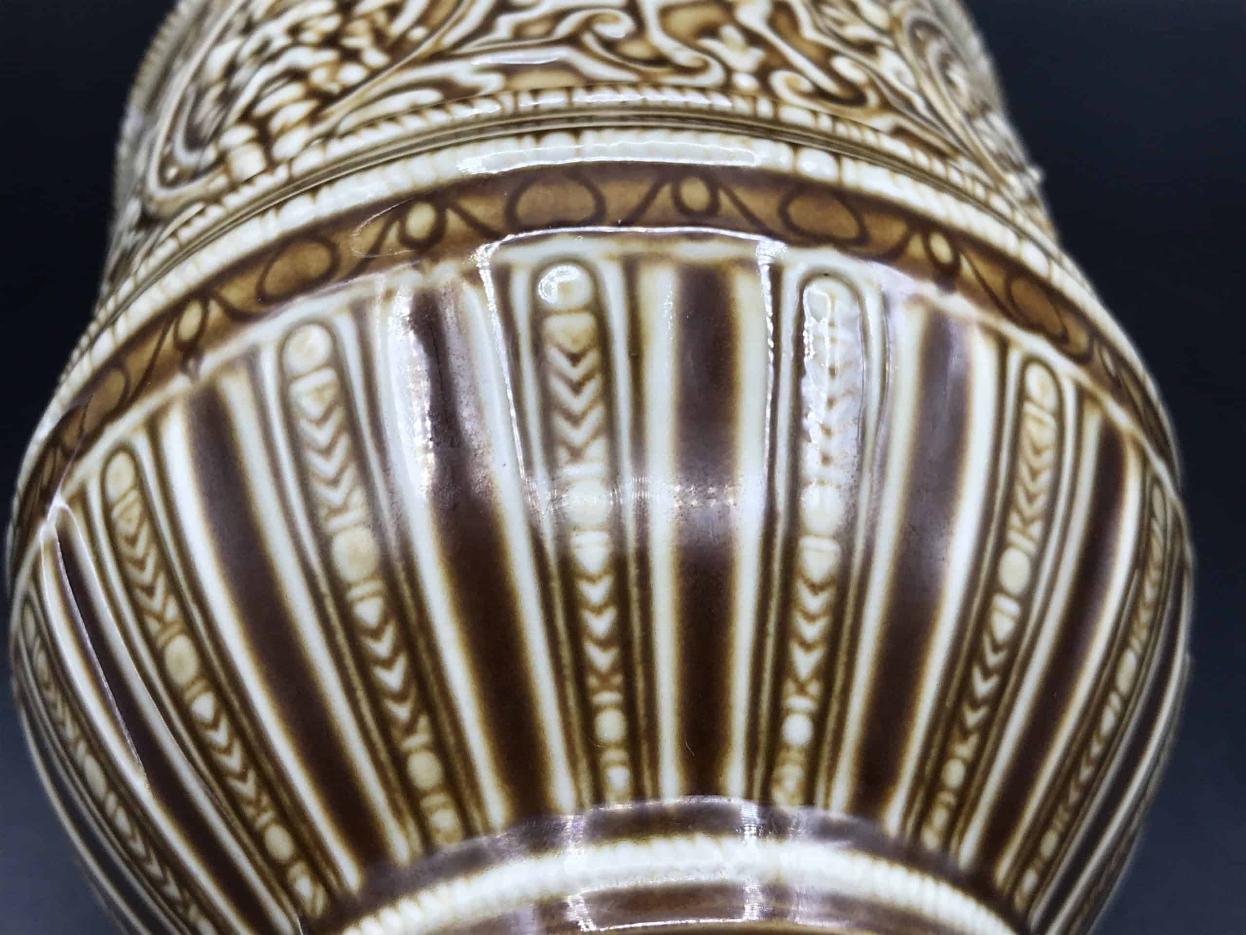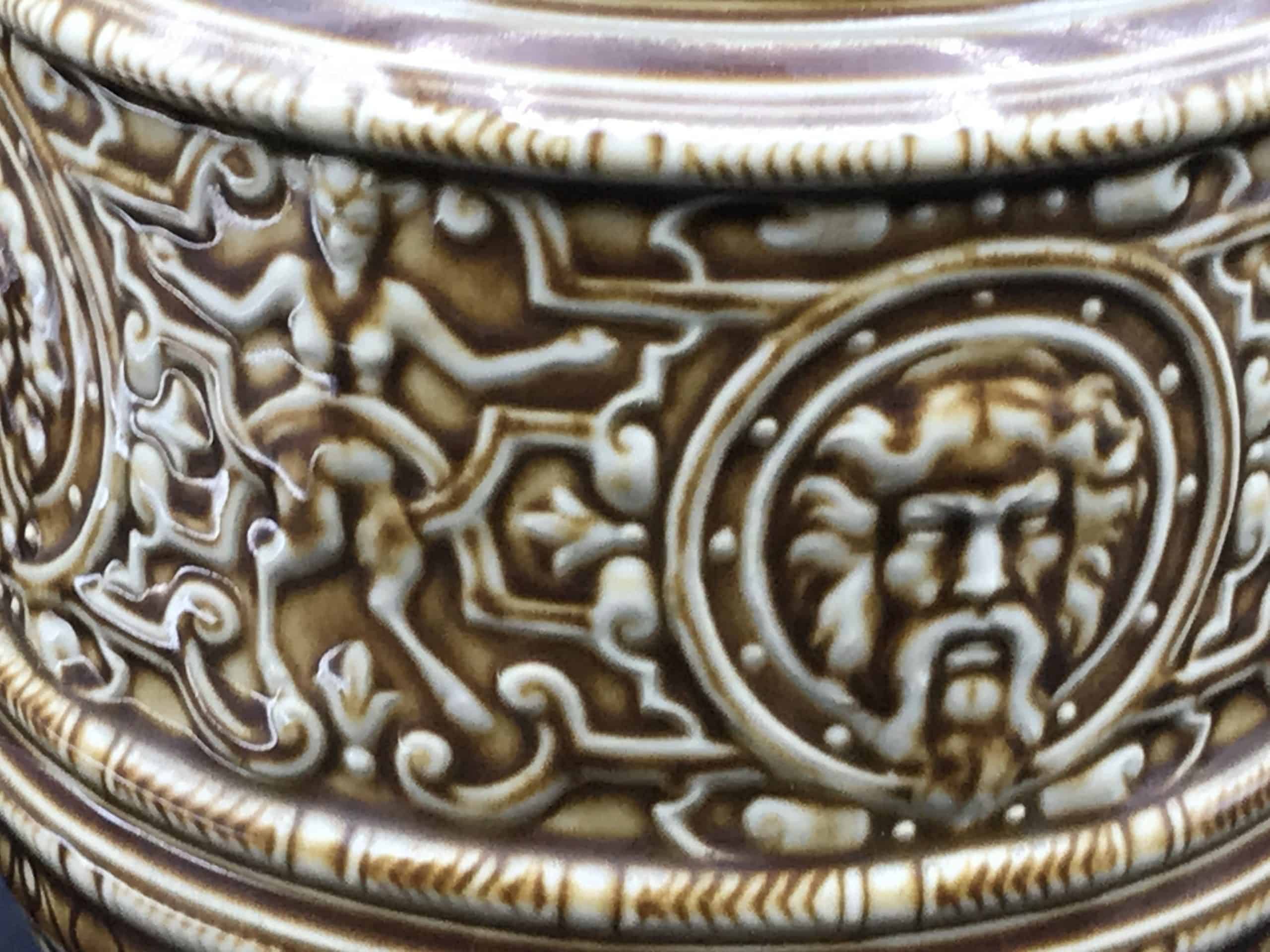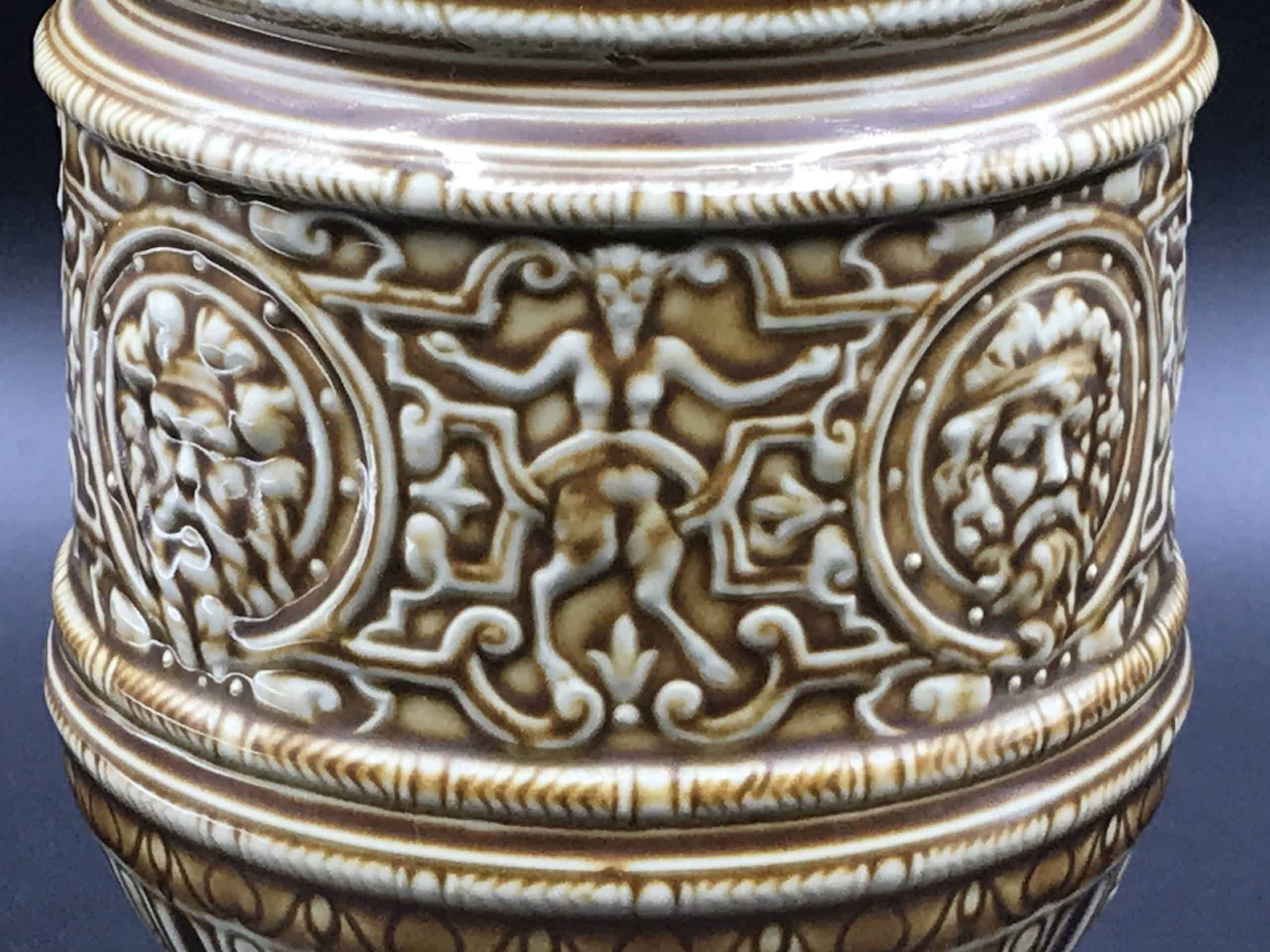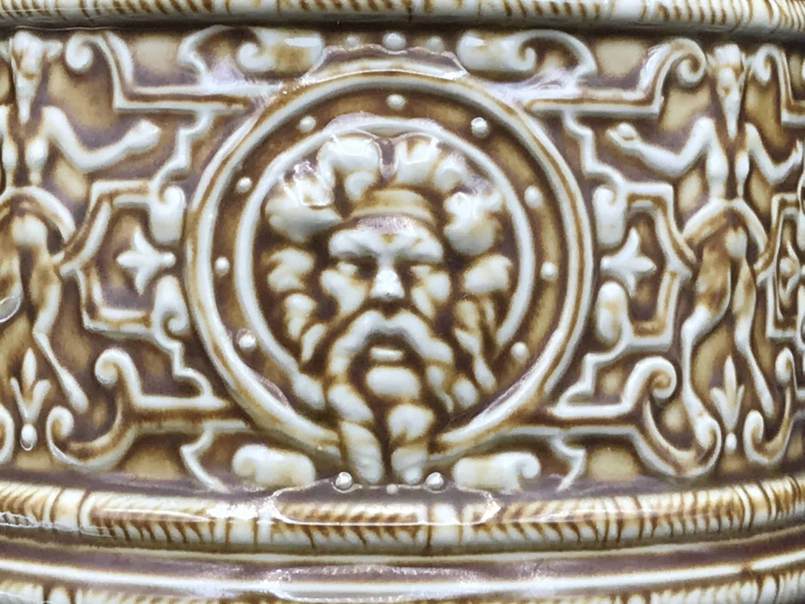 On offer here is a spectacular and highly detailed KPM Berlin porcelain beer stein, featuring intricate relief designs of mythical creatures and masks. This impressive antique German stein showcases the exquisite craftsmanship of the renowned Berlin porcelain manufactory (KPM).