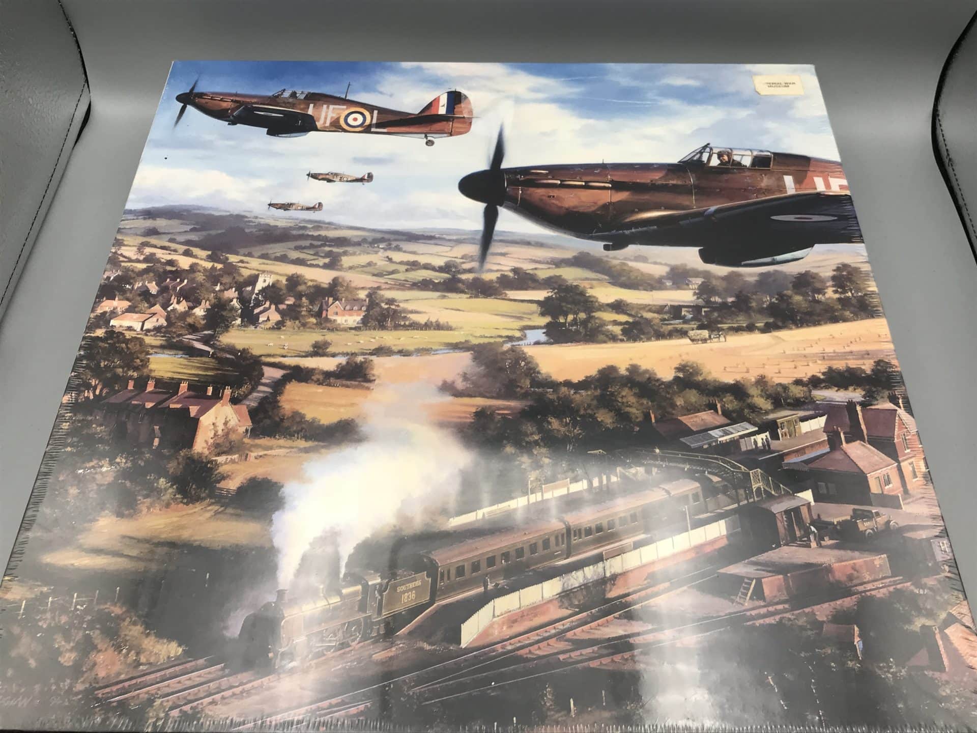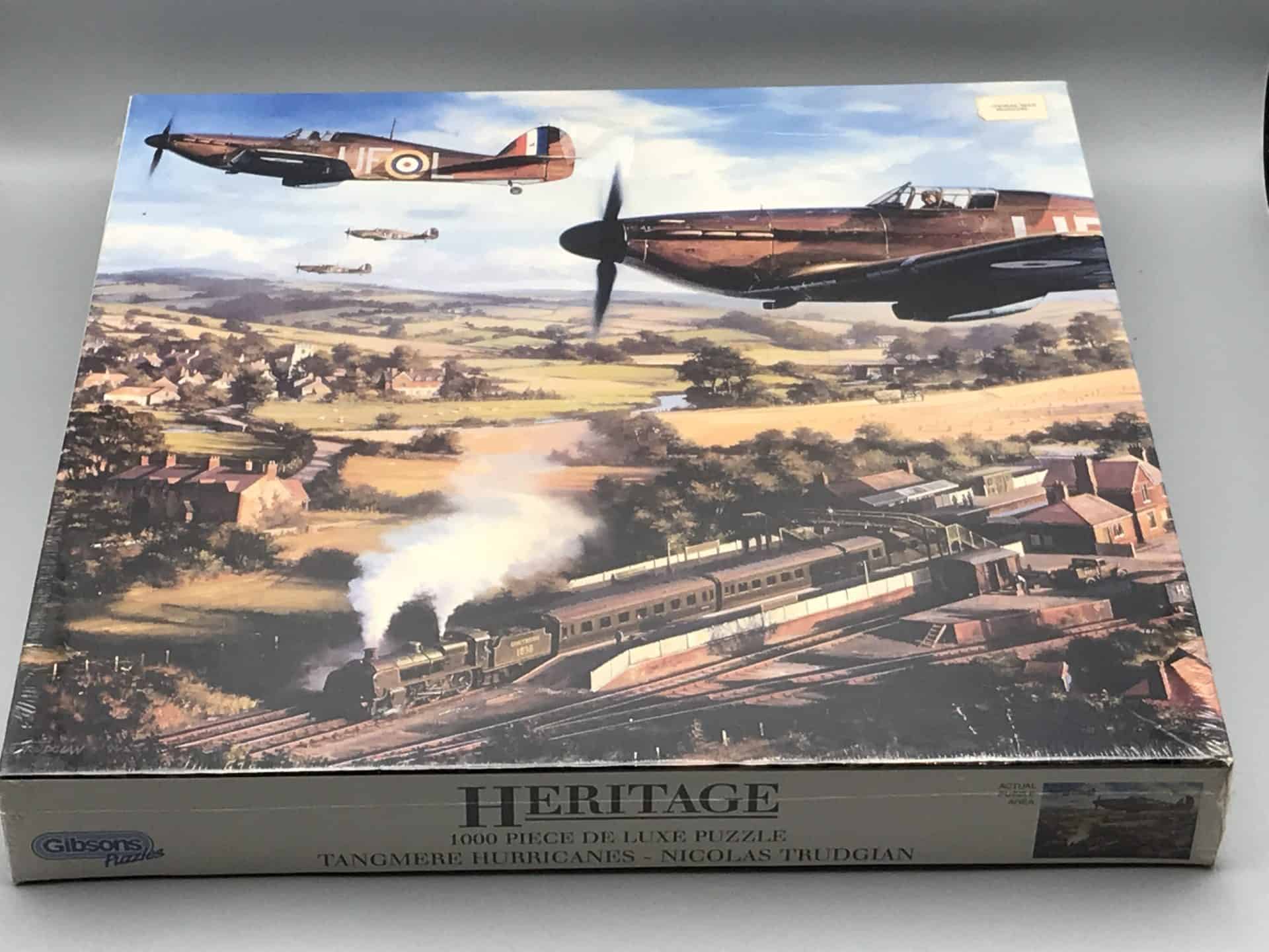 On offer is a Tangmere Hurricanes 1000-piece deluxe jigsaw puzzle from the Heritage series by Gibsons (H.P. Gibson & Sons Ltd., London), featuring artwork by noted aviation artist Nicolas Trudgian. This sealed example depicts Hawker Hurricanes of 601 Squadron climbing into the skies over southern England, with a steam locomotive passing through the landscape below — a hallmark of Trudgian’s detailed and atmospheric wartime scenes.