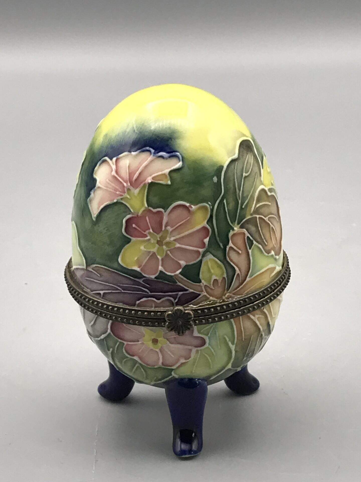 On offer is an Old Tupton Ware trinket box in the form of a three-legged egg, decorated with raised tube-lined floral motifs and hand-painted glazes in soft yellow, pink, green and blue tones. Old Tupton Ware was introduced in the early 2000s, known for its tube-lined ceramics inspired by British art pottery traditions, with each piece hand finished. This charming ceramic egg features a hinged lid and original label to the base. A fine example of an Old Tupton Ware trinket box that brings character and craftsmanship to a collection or display.