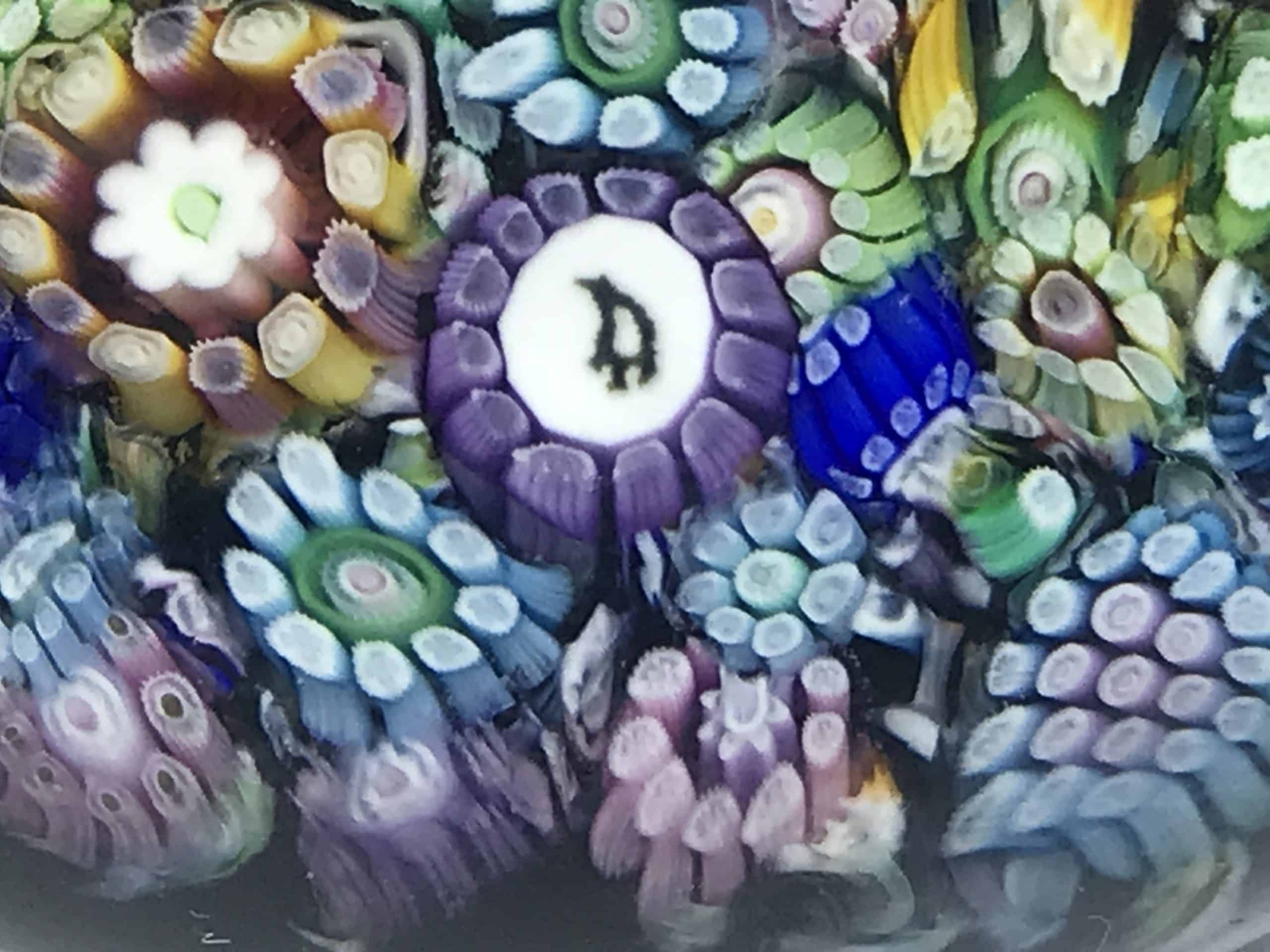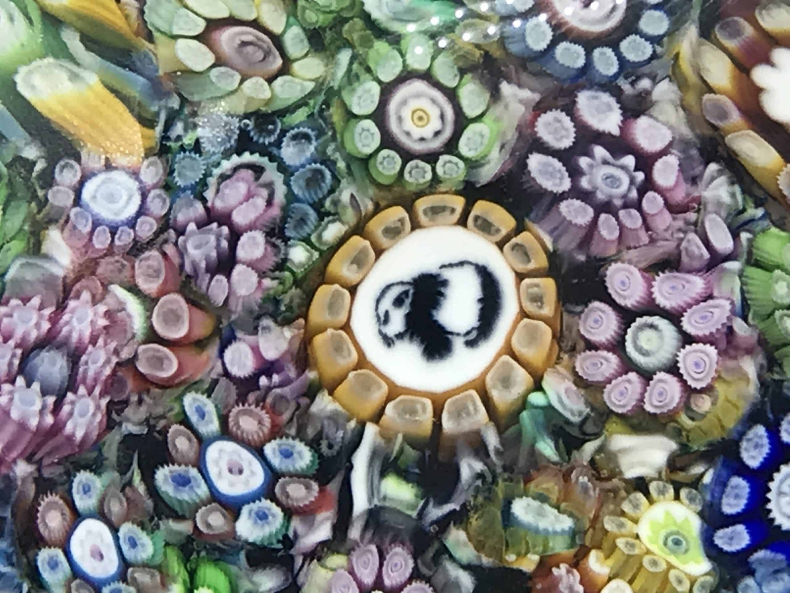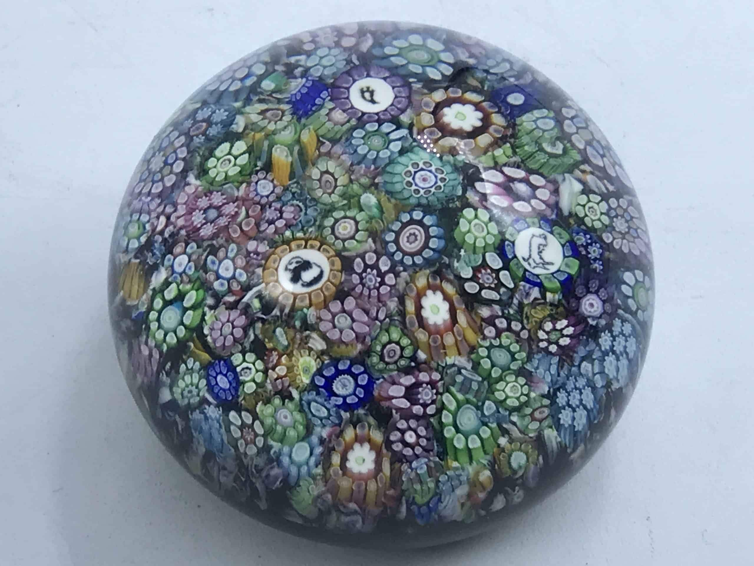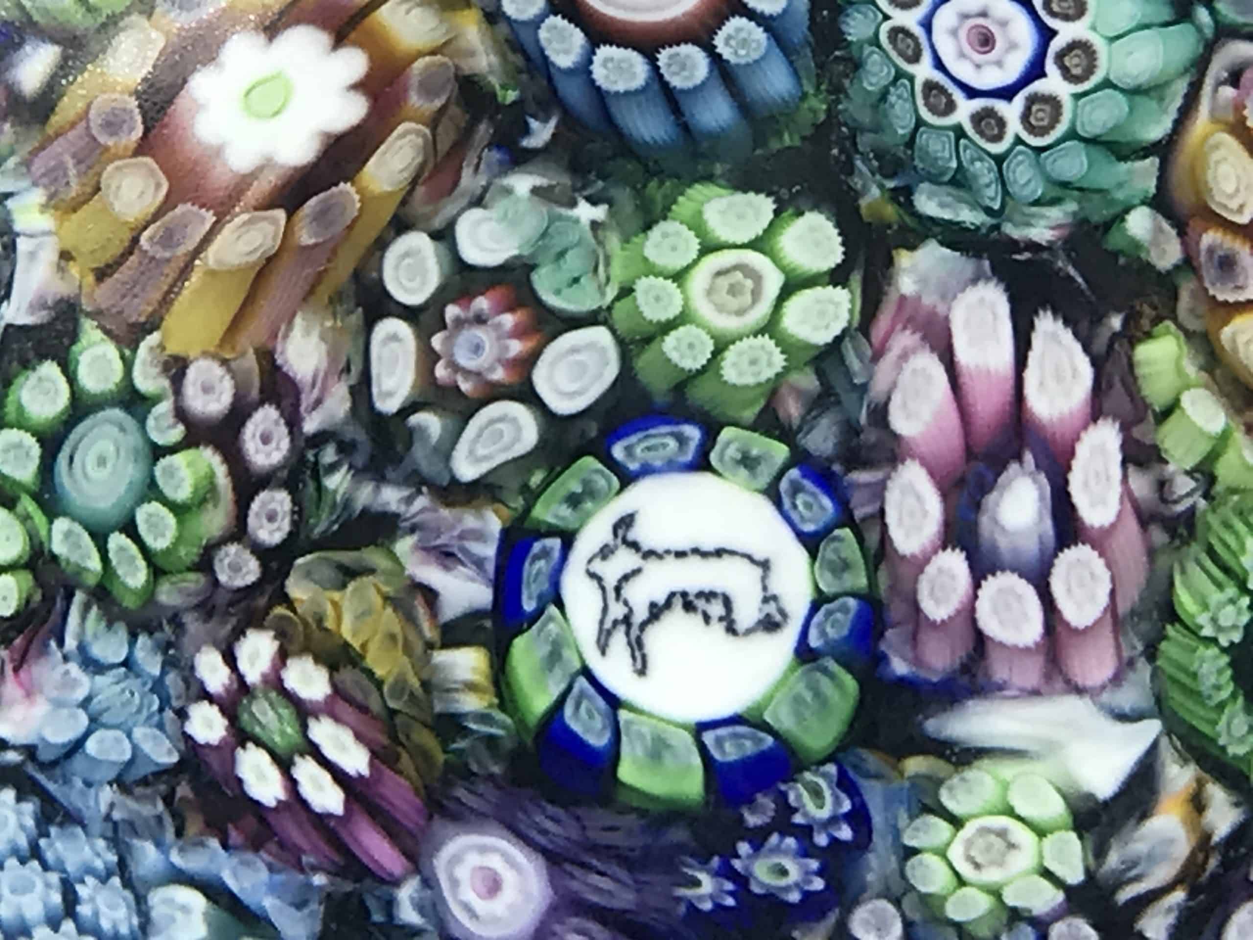 This exquisite paperweight features a dense, colorful millefiori scramble pattern, incorporating several silhouette canes, including: