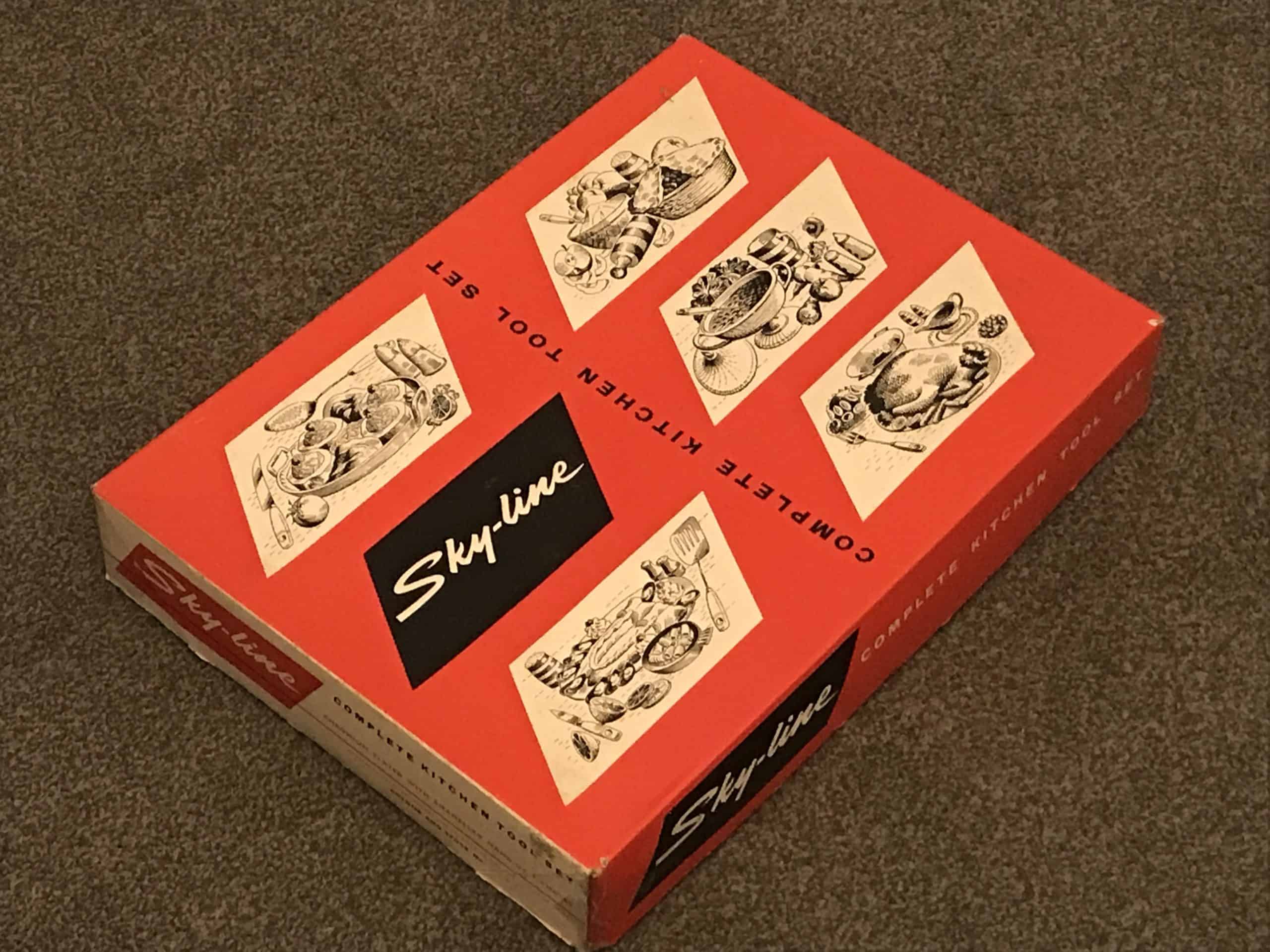 On offer here is a spectacular set of Rare Retro Red, Chrome, and Stainless Steel Skyline Kitchen Utensils Set. This set is original, it is boxed and complete. the full set looks mint as in the day it was made, the only piece that shows any signs of wear/use is the sifter the rest looks like it has never been out of the box, the box has foxing and all four corners have been restuck with clear tape, this is a full size set in very good condition is a very desirable color.