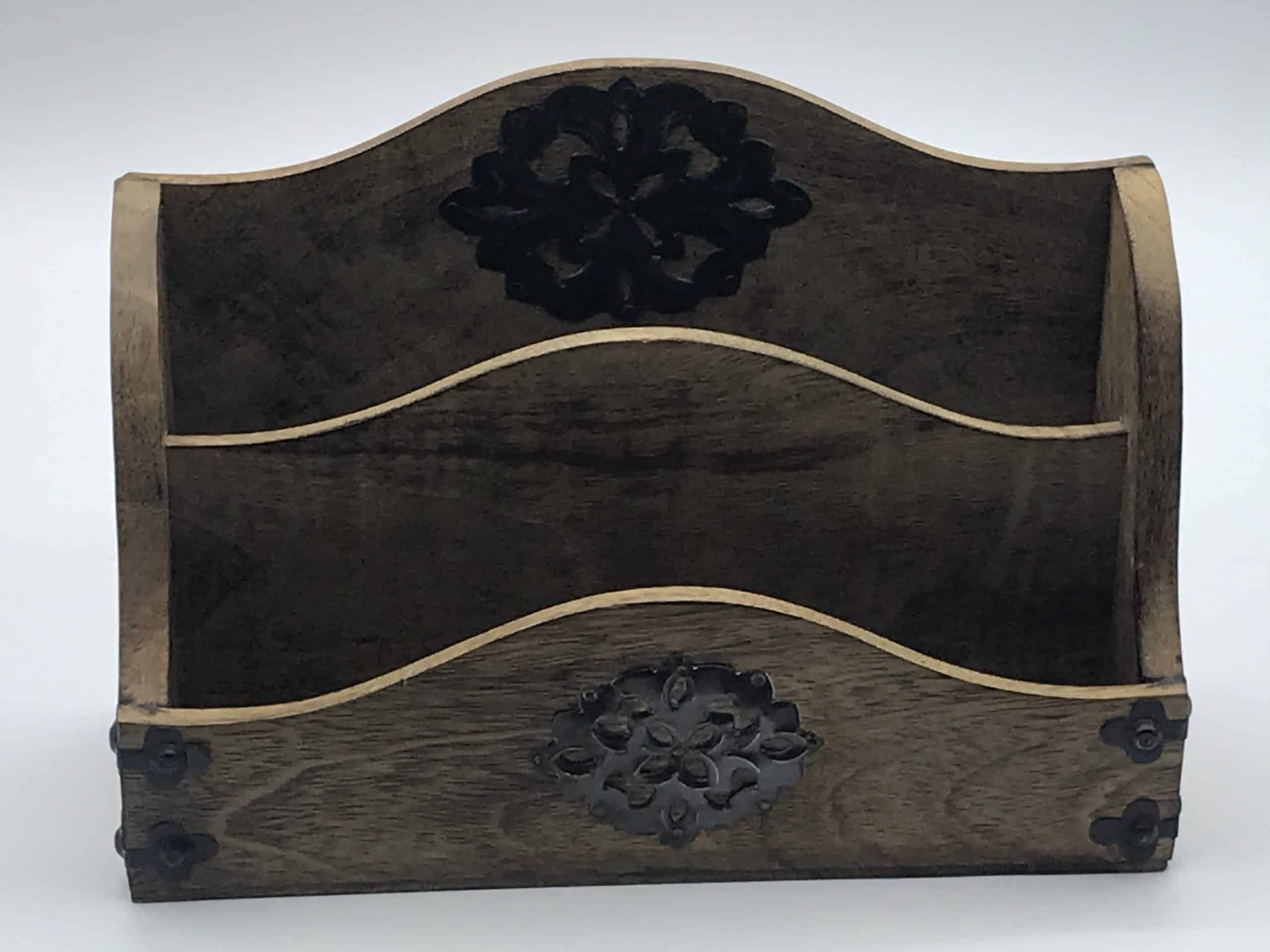 On offer here is a real nice quality solid wood letter rack with copper embellishments. This letter rack is in the arts and crafts style but not period. The condition is good. The letter rack measures at approx 10 inches wide, 3.5 inches deep, and 6 inches high.