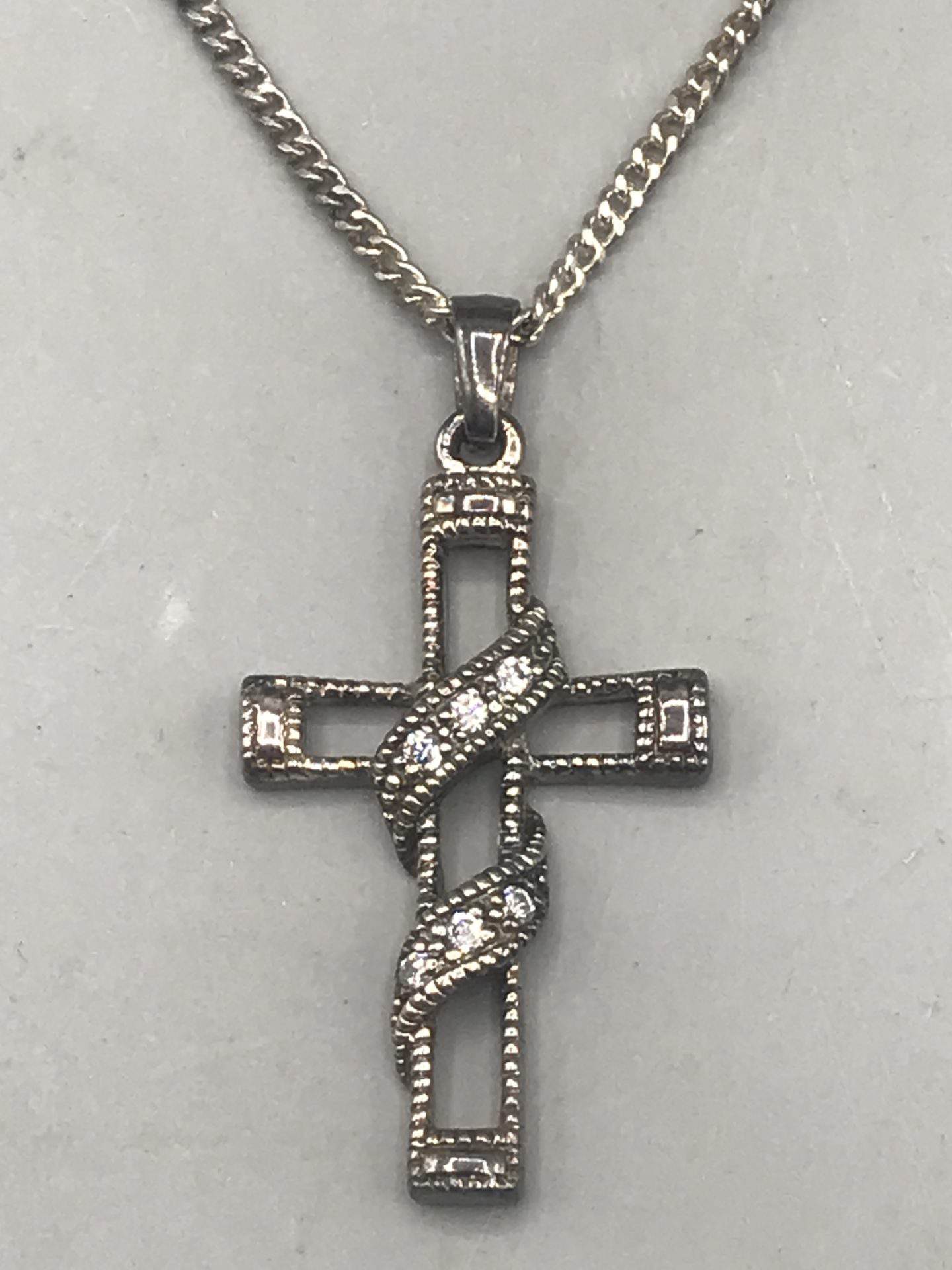 On offer is a sterling silver cross necklace featuring a classic openwork cross pendant paired with a fine silver chain. The design centres on a stylised twisted rope motif running through the cross, giving depth and subtle texture to the form while retaining a clean traditional outline.