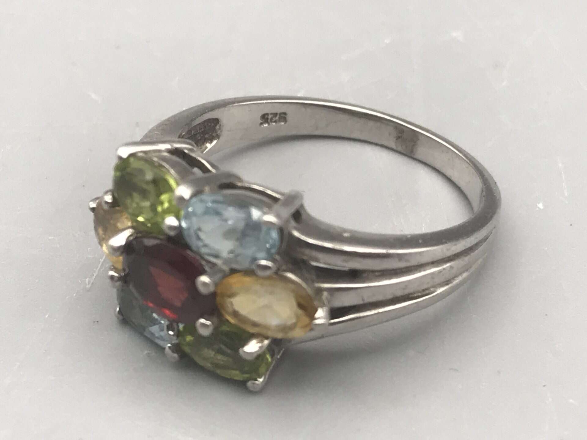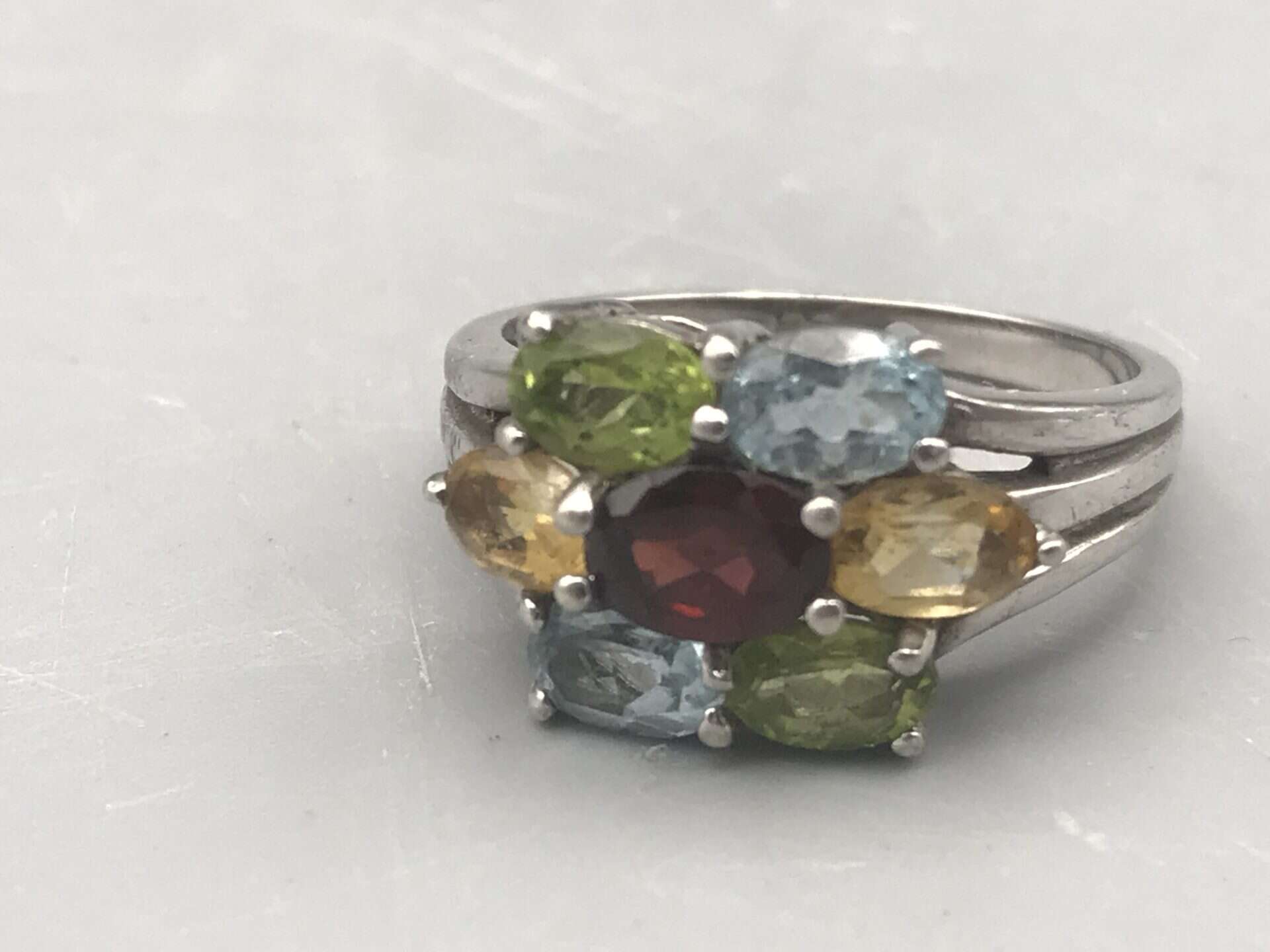 On offer is a beautiful sterling silver multi-gemstone cluster ring, crafted in solid 925 silver and set with vibrant oval-cut stones including blue topaz, peridot, citrine and a central garnet. A contemporary piece inspired by traditional floral motifs, it reflects the enduring appeal of colourful gemstone jewellery and fine silver craftsmanship. Whether worn daily or displayed as part of a curated jewellery collection, this ring offers both elegance and versatility.