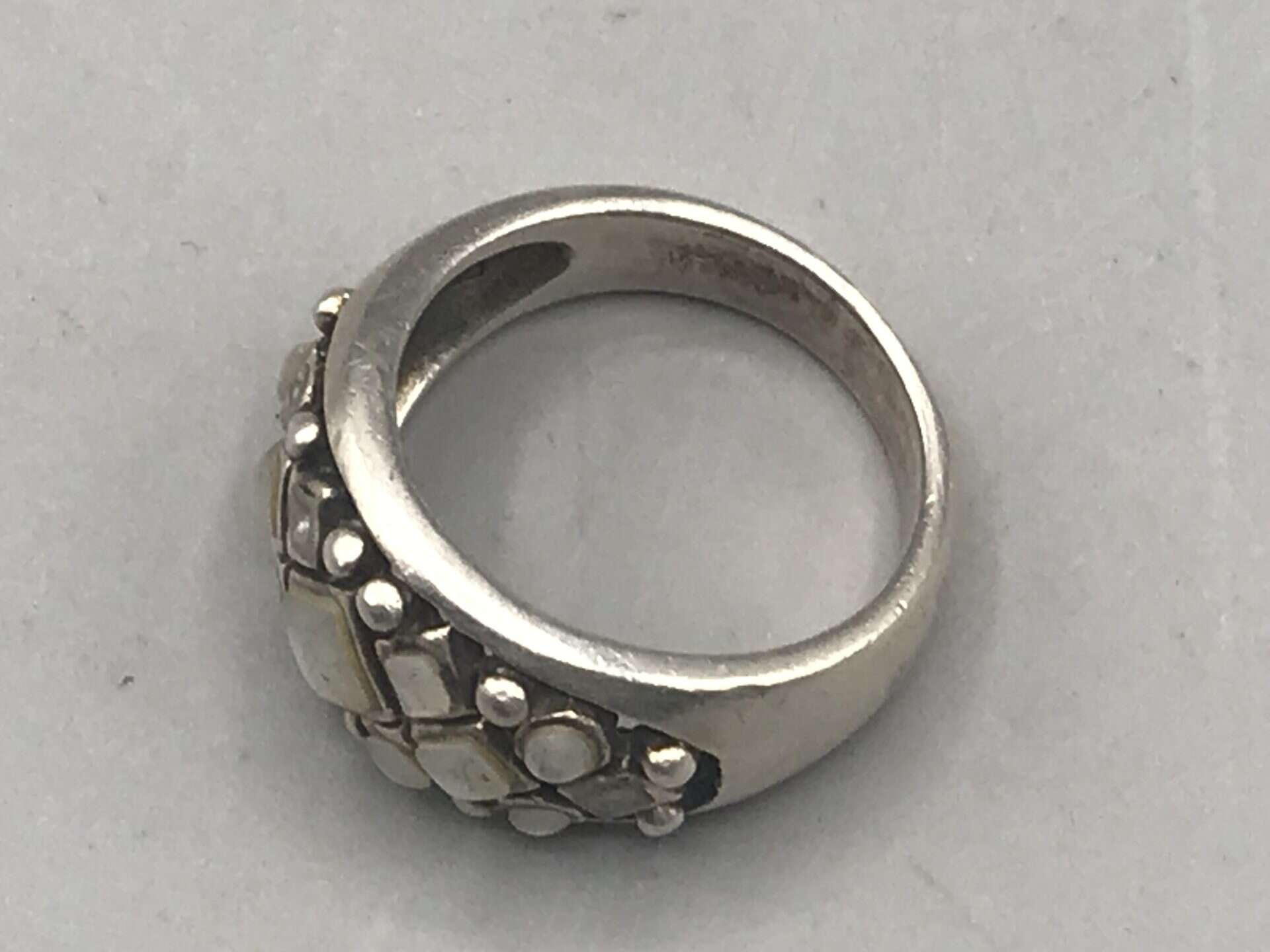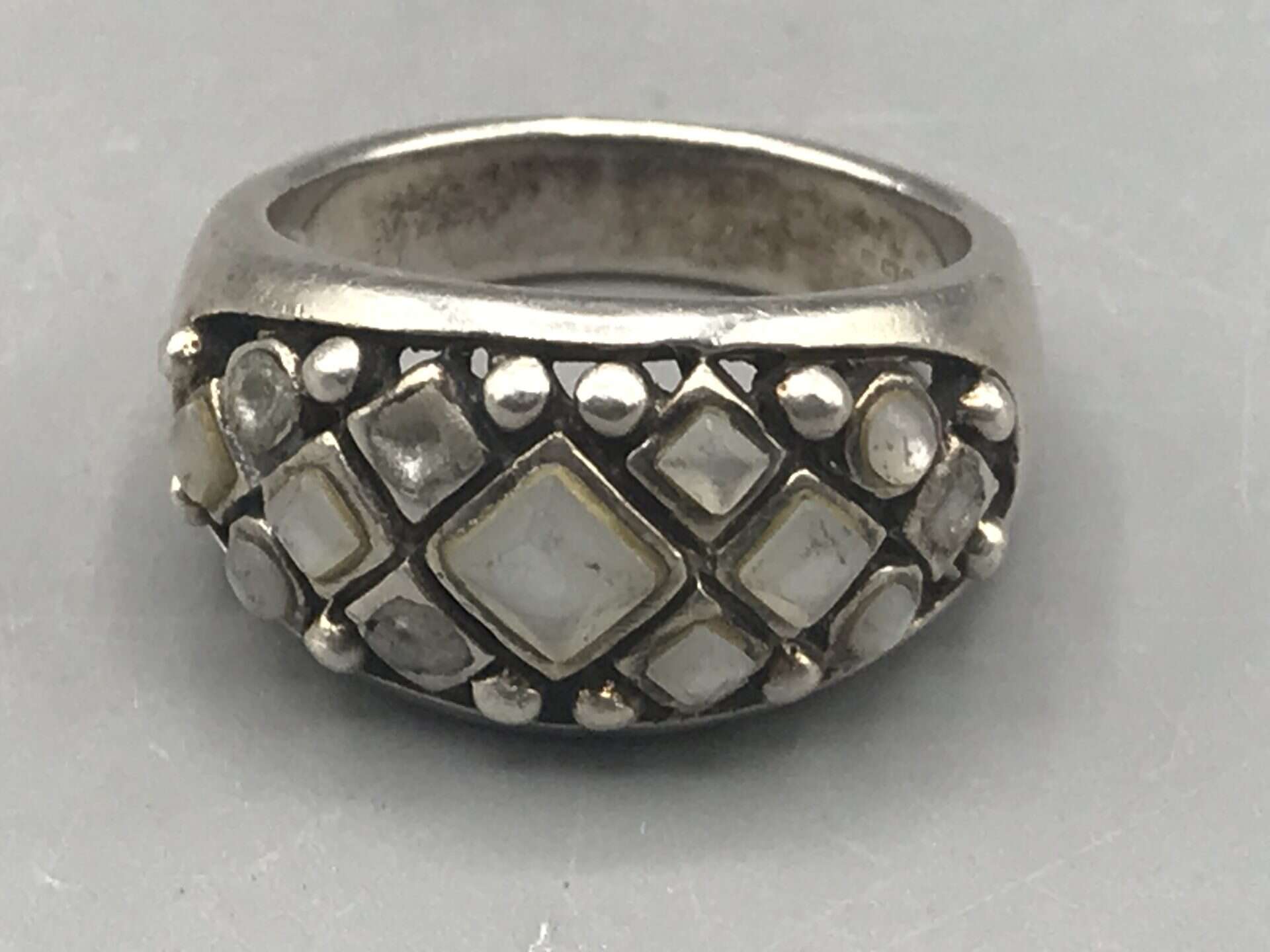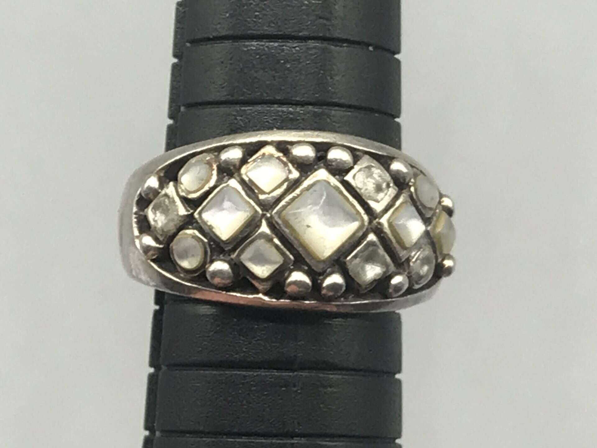 The wide band form and structured setting suggest a contemporary or late 20th century design, combining modern styling with traditional silversmithing techniques. The stones appear bezel set within a decorative grid, giving the ring strong visual presence while remaining wearable. A well made sterling silver ring with character, suitable for collectors of vintage and modern silver jewellery alike.