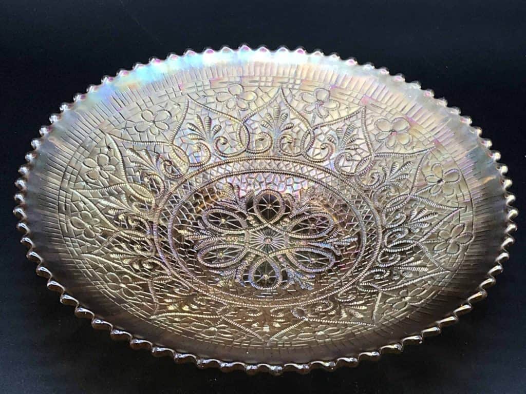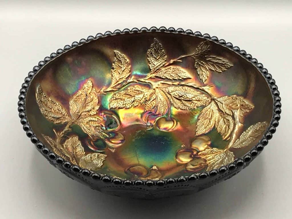 The base color of carnival glass is visible on the underside or rim where the iridescent finish doesn’t obscure it. Common base colors include marigold, green, and amethyst, while rare colors like red, cobalt blue, and Vaseline glass are highly sought after.
